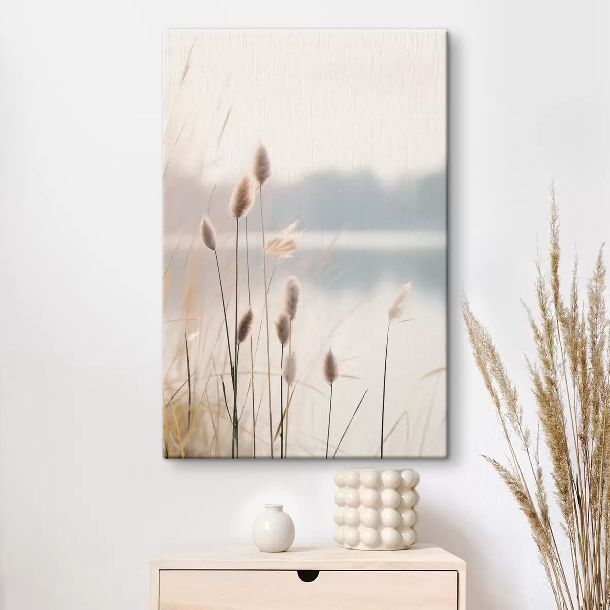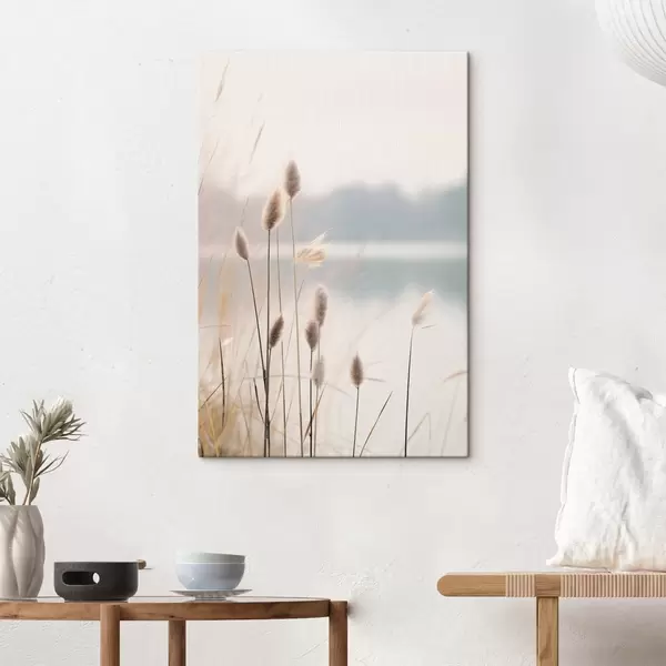 Gemälde Weiche Schilfrohre an einem nebligen Seeufer, pastellbeige Farbtöne Art. s46504