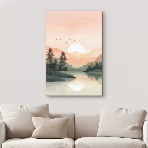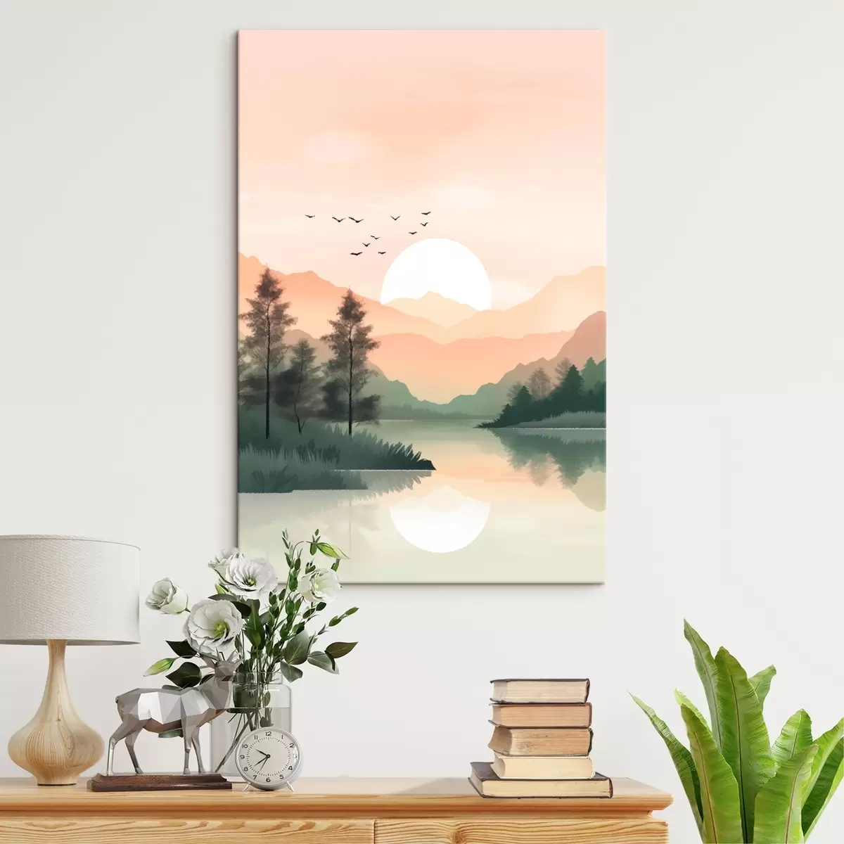 Gemälde Pastellfarbener Sonnenuntergang über einem ruhigen See mit fernen Hügeln und Vögeln Art. s46508