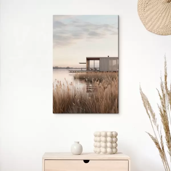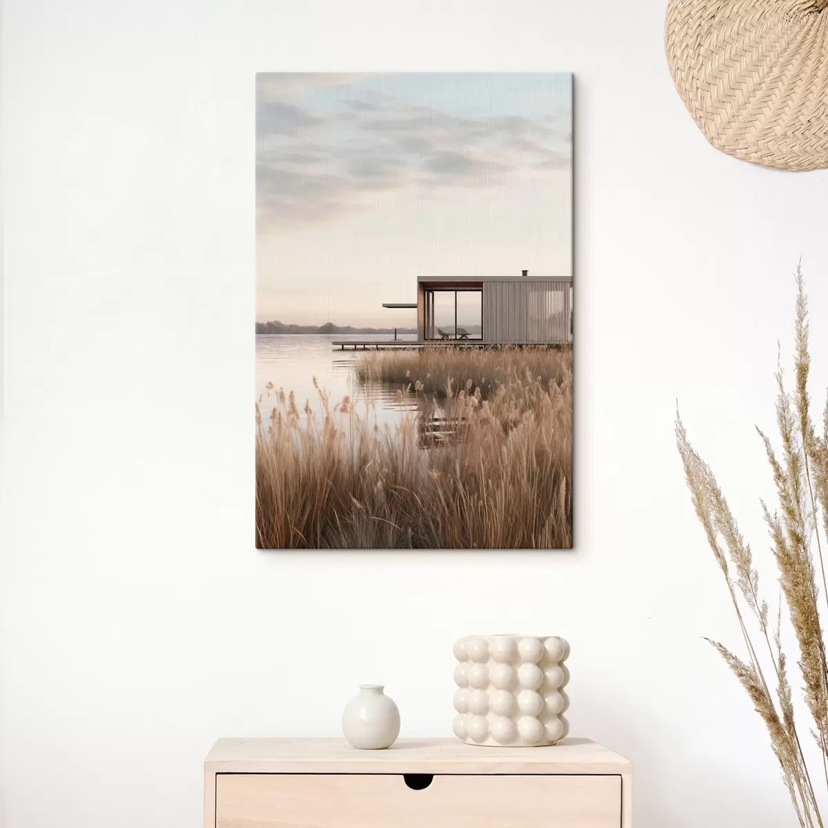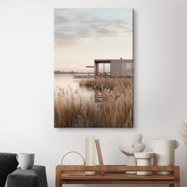 Gemälde Moderne Hütte am Seeufer inmitten von Schilf in der sanften Abenddämmerung Art. s46513