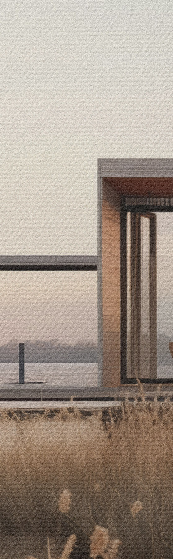 Fototapete Moderne Hütte am Seeufer inmitten von Schilf in der sanften Abenddämmerung s46513
