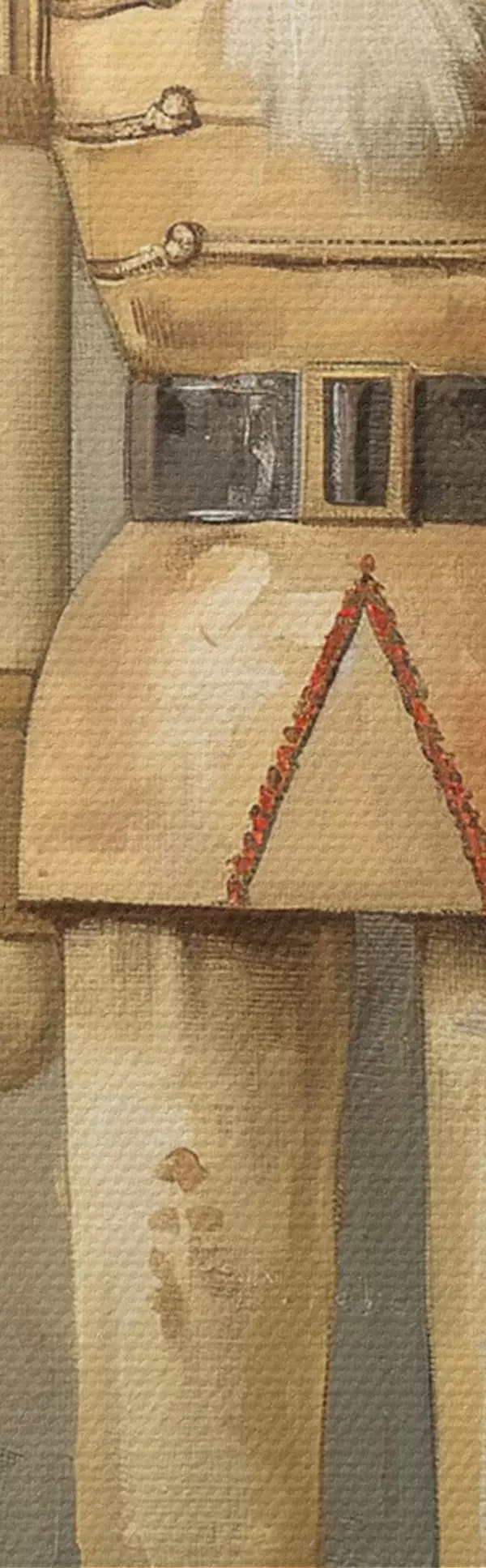 Das Bild kann vorsichtig mit einem trockenen, weichen Tuch oder Schwamm abgewischt werden; es wird nicht empfohlen, feuchte Produkte zu verwenden. Die Verwendung eines feuchten Schwamms ist nur zulässig, wenn das Bild lackiert wurde.