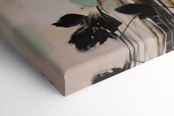 Gemälde Rosa und schwarze Blumen mit Blättern, sanfte Pastellfarben, abstraktes Blumenarrangement, minimalistische Kunst Art. s46687