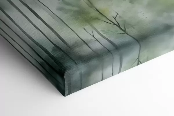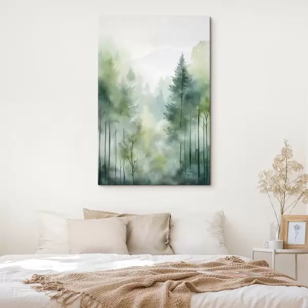 Gemälde Aquarellmalerei, die einen nebligen Wald mit hohen Kiefern und Bergen im Hintergrund darstellt Art. s46690