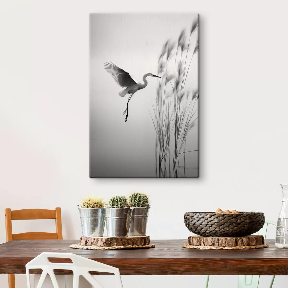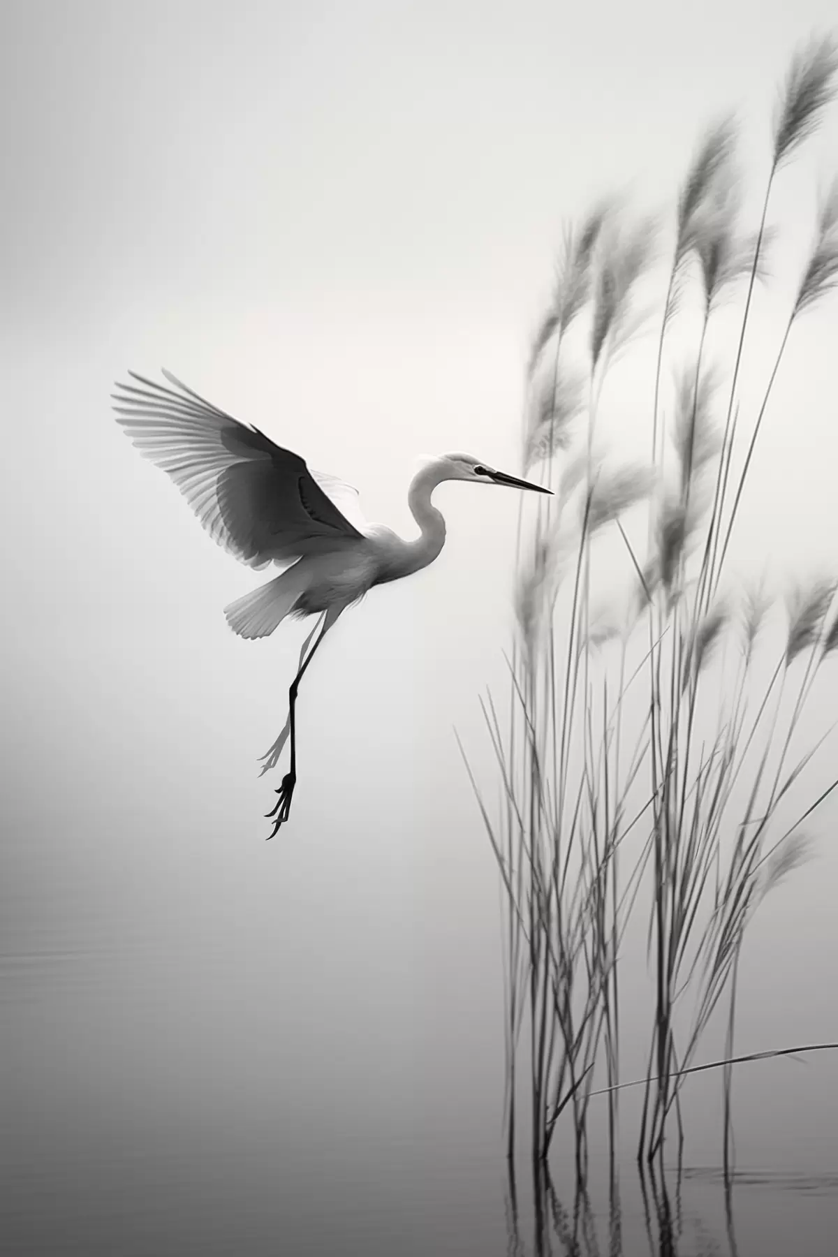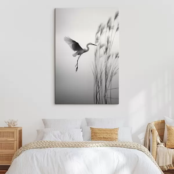 Gemälde Ein weißer Reiher mit ausgebreiteten Flügeln, der in der Nähe von hohen Schilfpflanzen fliegt, minimalistische Komposition in Schwarz und Weiß Art. s46693