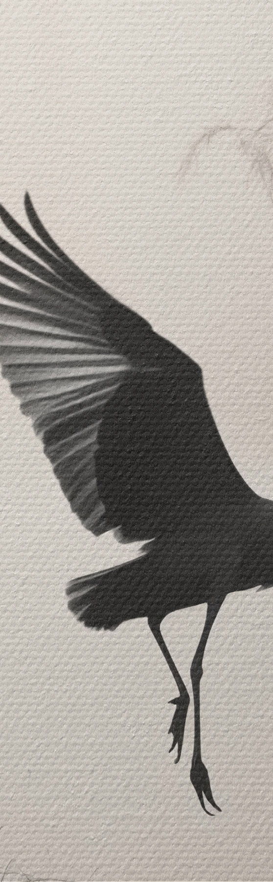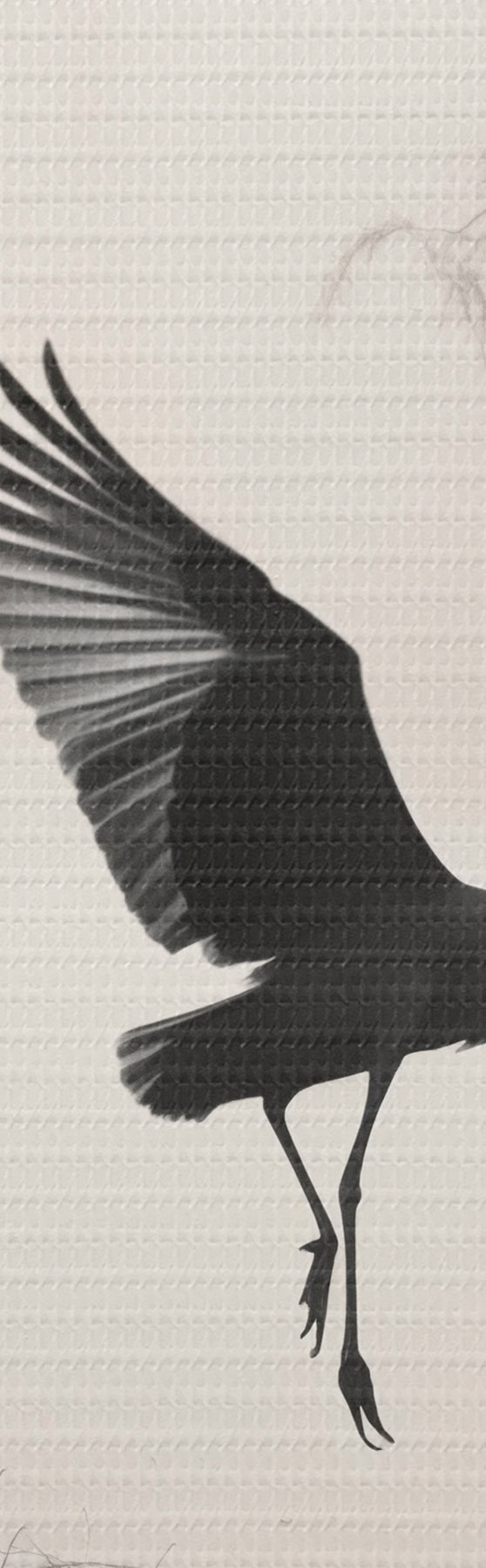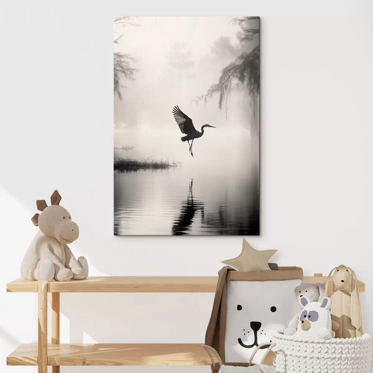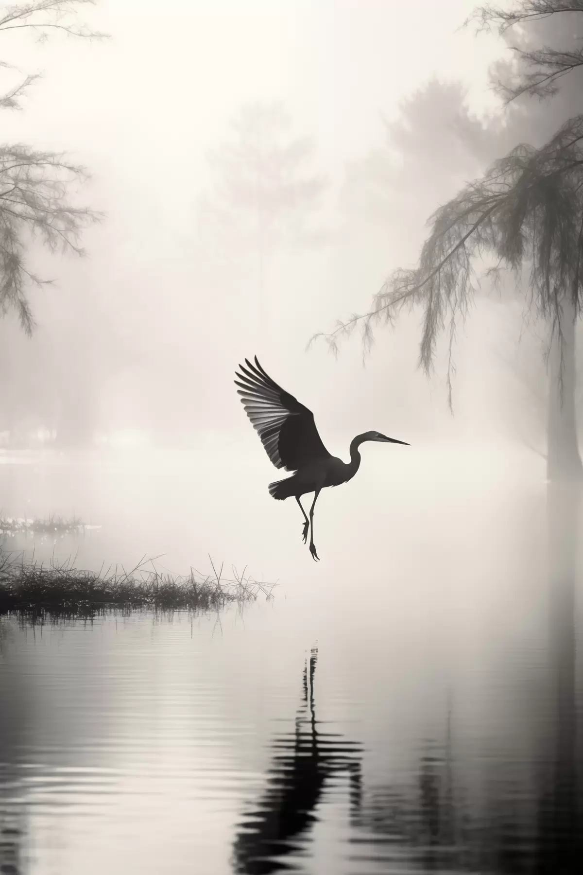 Gemälde Ein weißer Reiher mit ausgebreiteten Flügeln, der in der Nähe von hohen Schilfpflanzen fliegt, minimalistische Komposition in Schwarz und Weiß Art. s46694