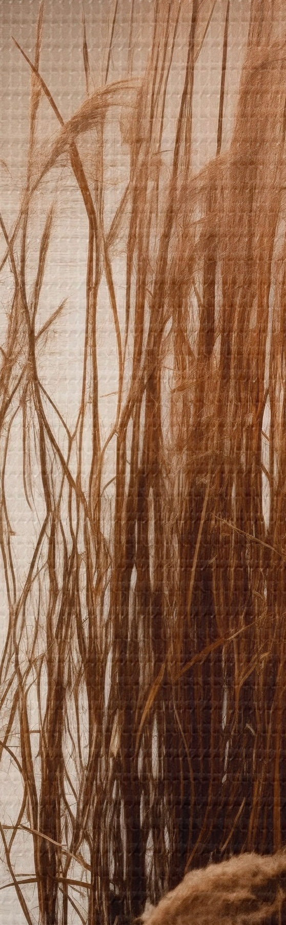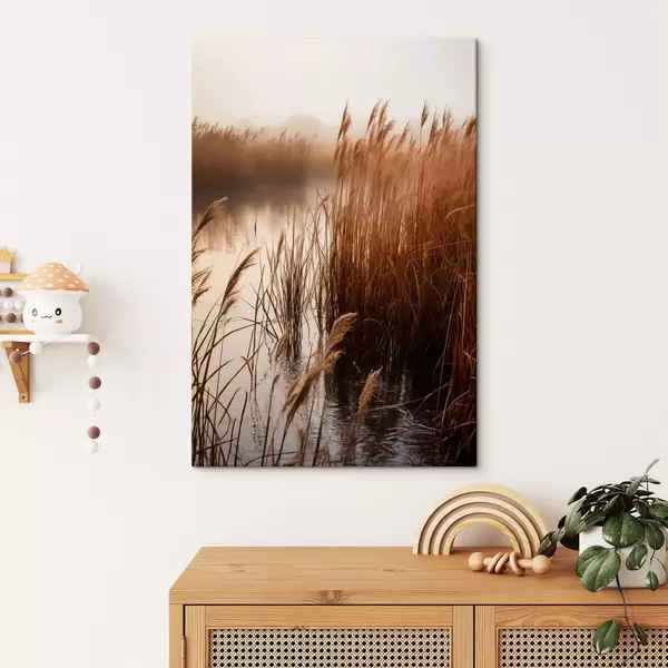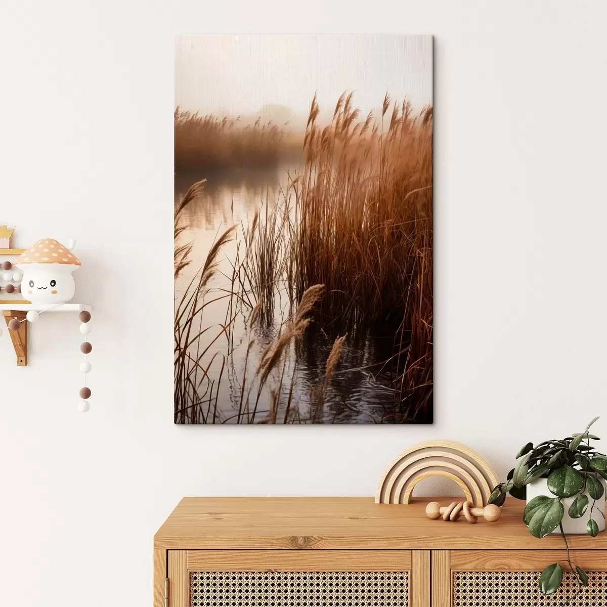 Gemälde Hohe Schilfpflanzen wachsen in einem Gewässer, das Wasser spiegelt die Schilfpflanzen wider, nebliger Hintergrund, sanftes Licht, Naturszene Art. s46695