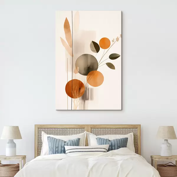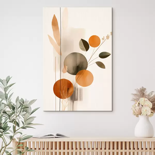 Gemälde Abstrakte Malerei-Imitation mit orangefarbenen und grauen Kreisen, Blättern und Zweigen, moderner Stil, Aquarelleffekt Art. s46697