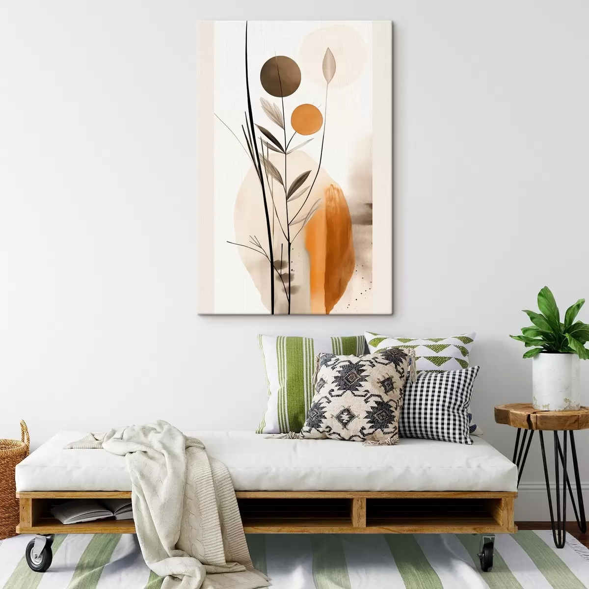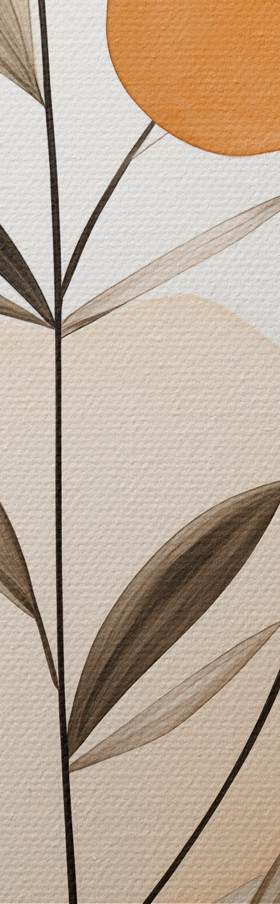 Gemälde Abstrakte Malerei-Imitation mit orangefarbenen und grauen Kreisen, Blättern und Zweigen, moderner Stil, Aquarelleffekt Art. s46698
