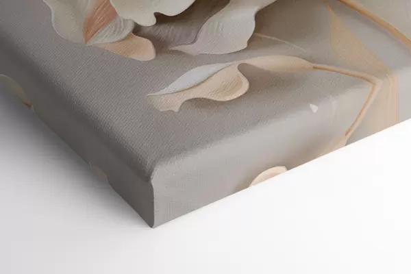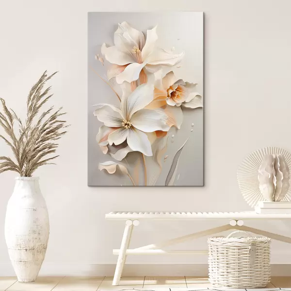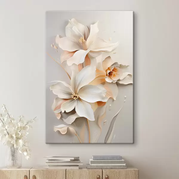 Gemälde Weiße Blumen, Blütenblätter mit sanften Schatten, hellbeiger Hintergrund, elegante Komposition, minimalistischer Stil Art. s46699