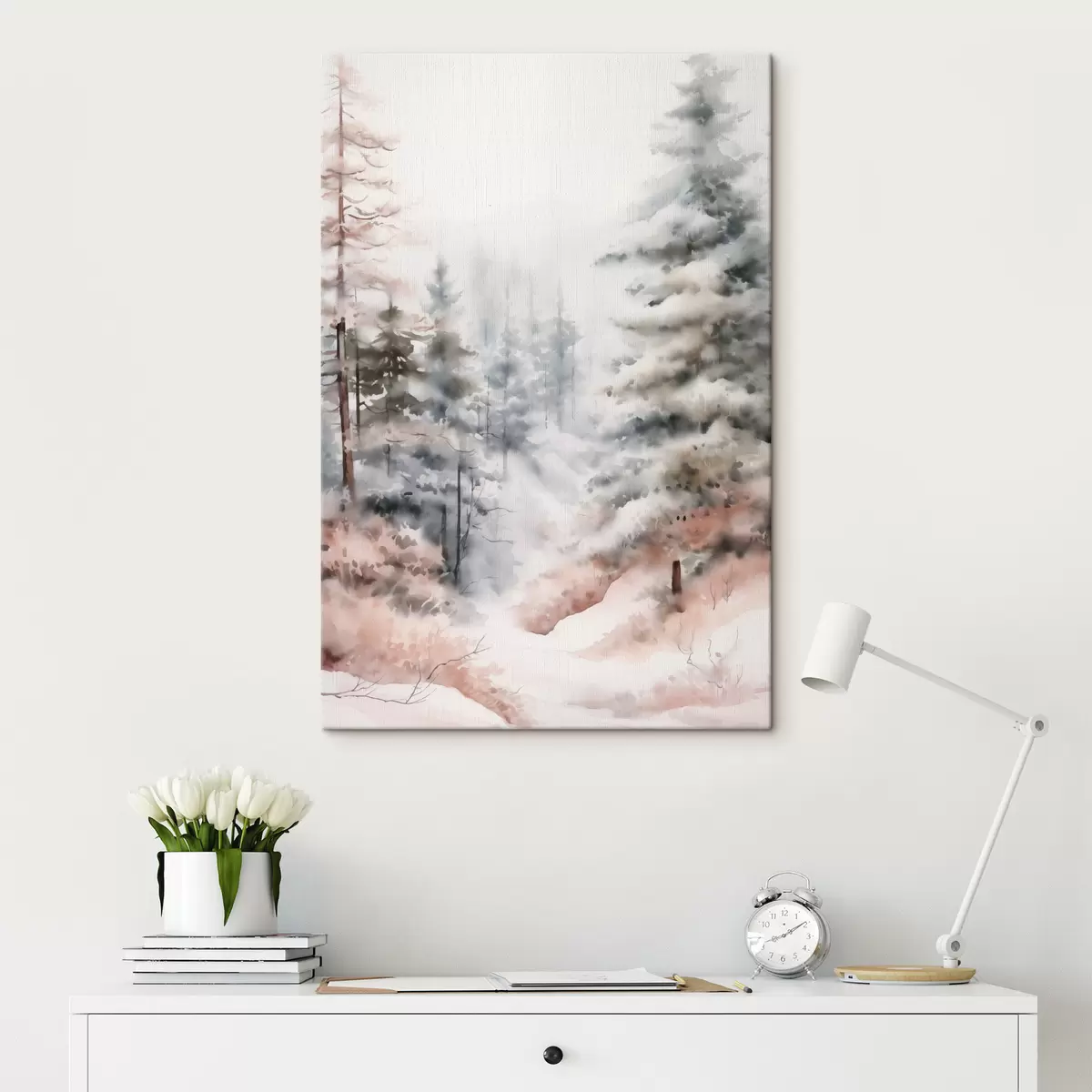 Gemälde Hohe, schneebedeckte Kiefern stehen in einem nebligen Wald, eine sanfte, gedämpfte Winterszene. Art. s46702