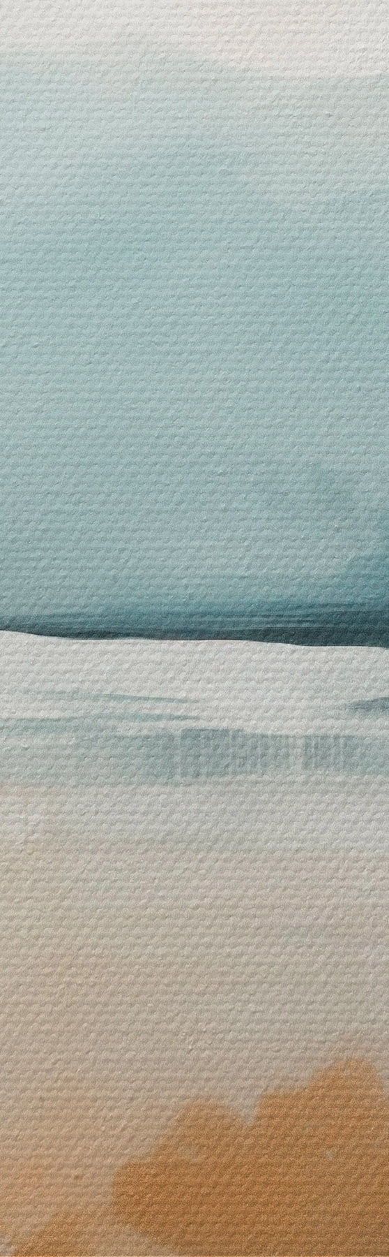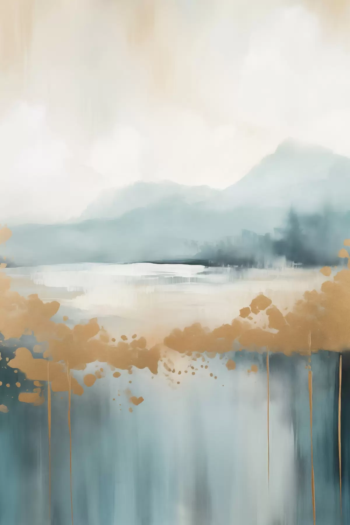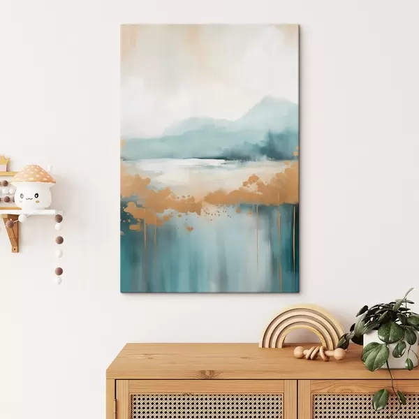 Fototapete Abstrakte Landschaft mit Bergen und See in Blaugrün und strukturiertem Gelb, weiche Pinselstriche, minimalistisches Kunstwerk s46703