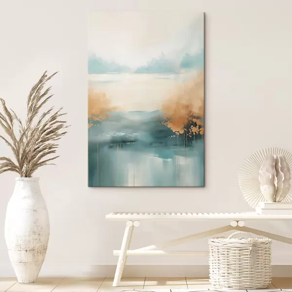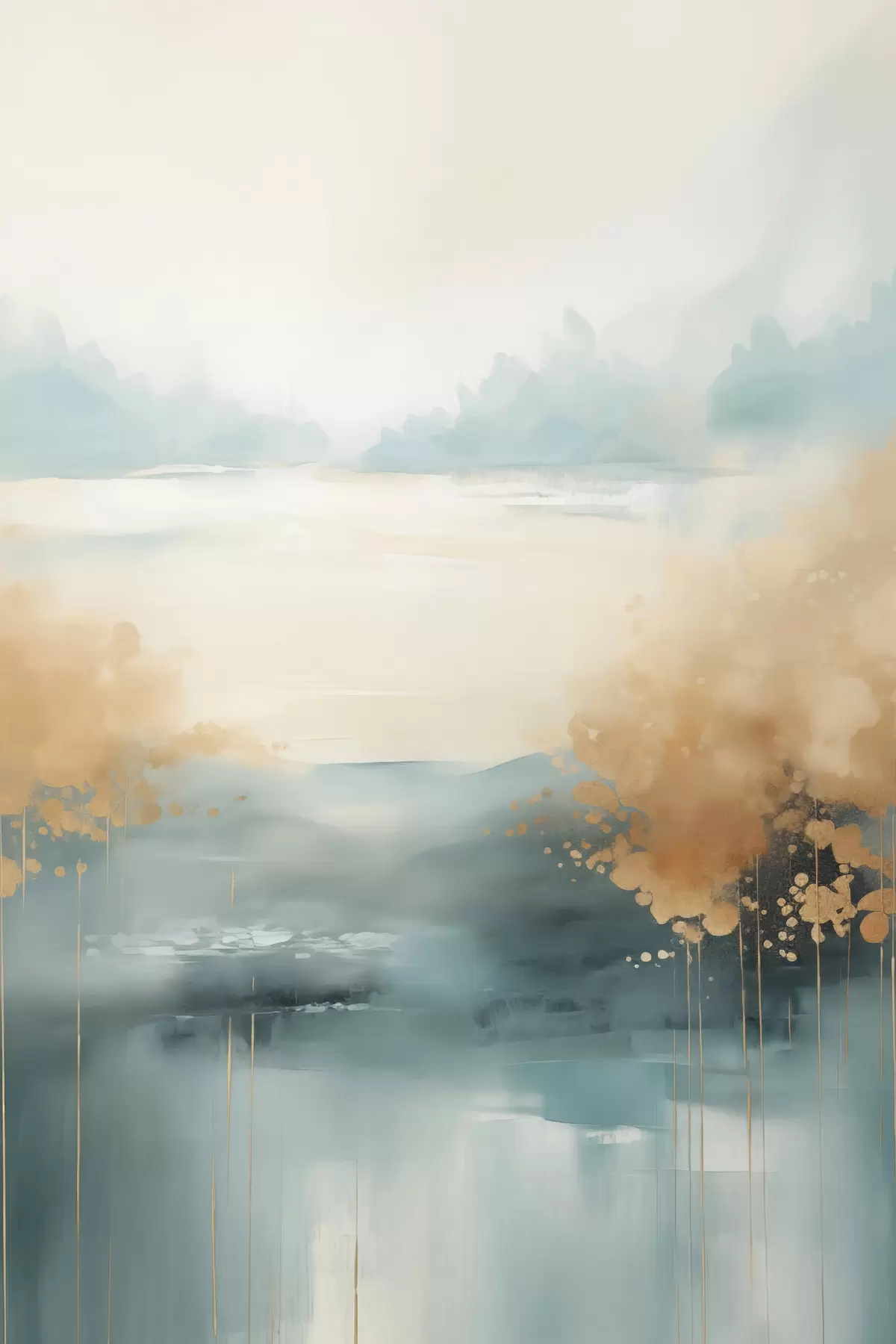 Fototapete Abstrakte Landschaft mit Bergen und See in Blaugrün und strukturiertem Gelb, weiche Pinselstriche, minimalistisches Kunstwerk s46704