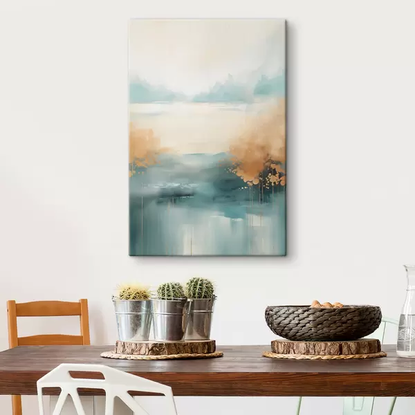 Gemälde Abstrakte Landschaft mit Bergen und See in Blaugrün und strukturiertem Gelb, weiche Pinselstriche, minimalistisches Kunstwerk Art. s46704