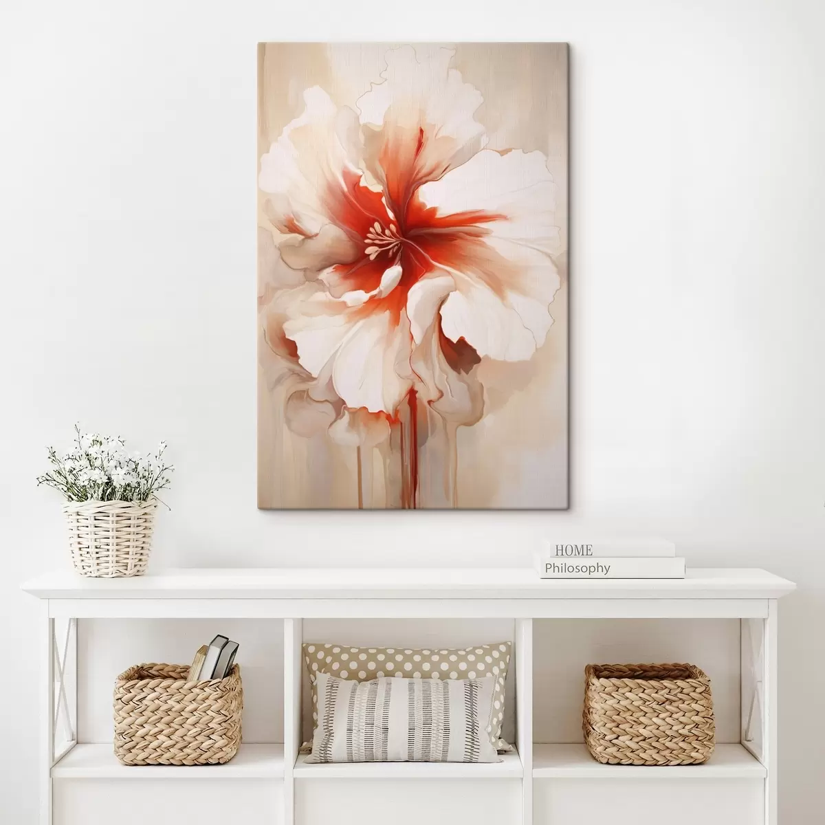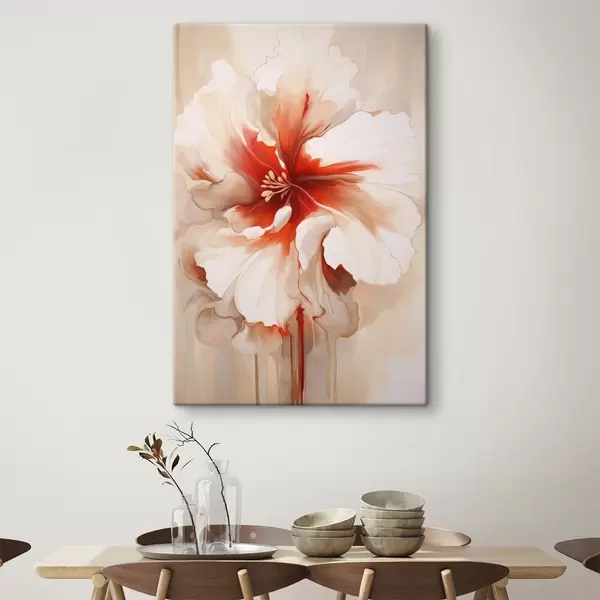 Gemälde Nahaufnahme einer weiß-roten Blume mit halbtransparenten Blütenblättern und fließenden Farbtropfen Art. s46941