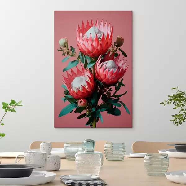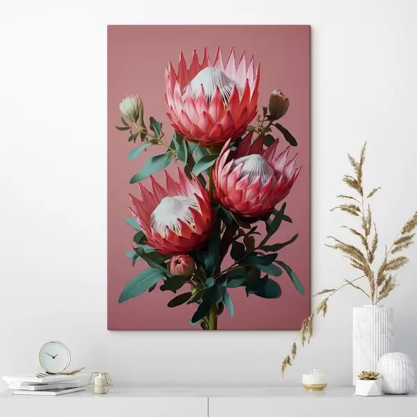 Gemälde Protea-Strauß mit roten Blütenblättern und grünem Laub auf rosa Hintergrund Art. s46946