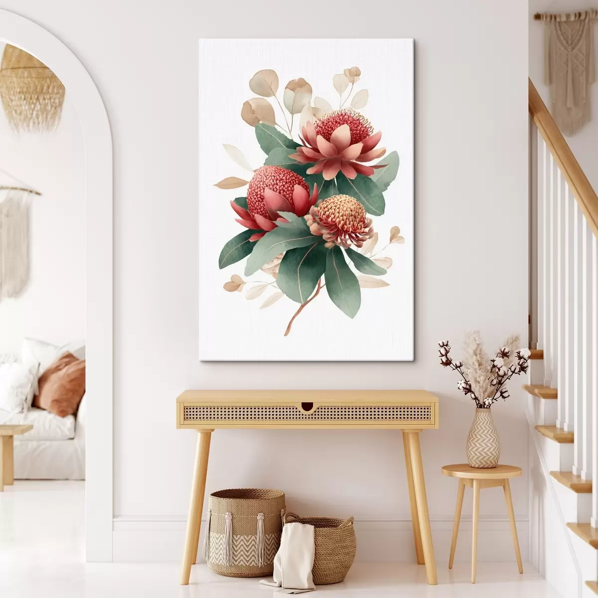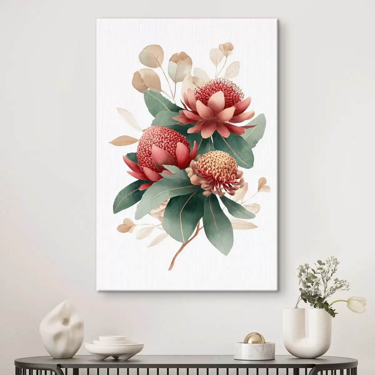 Gemälde Blumenkomposition mit großen Proteas und Eukalyptus im modernen Stil digitaler Malerei Art. s46955