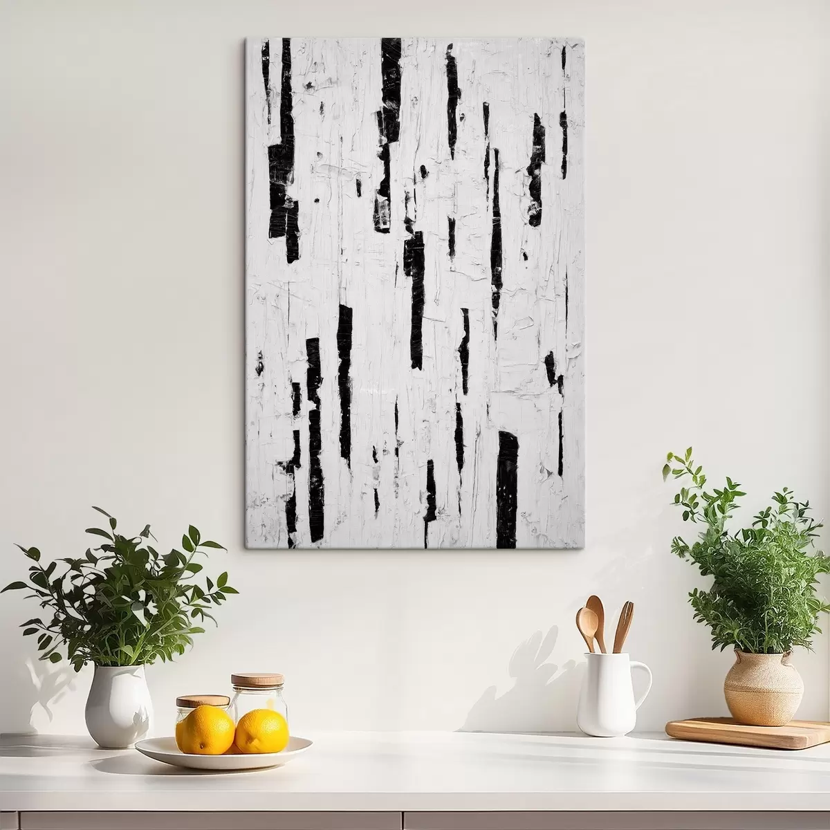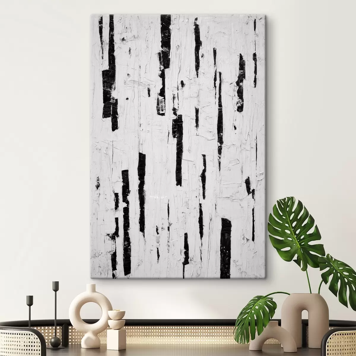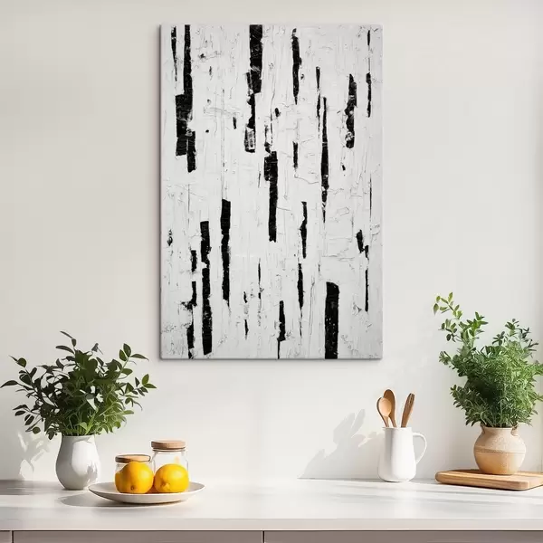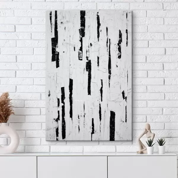 Gemälde Abstrakte Komposition mit schwarzen vertikalen Pinselstrichen auf weißem Hintergrund im Stil der Ölmalerei Art. s46956