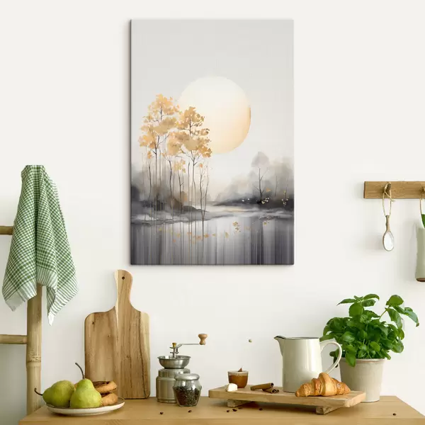 Gemälde Dekorative abstrakte Landschaft, hohe Bäume mit gelben Blättern, ein Fluss und Nebel im Hintergrund Art. s47014