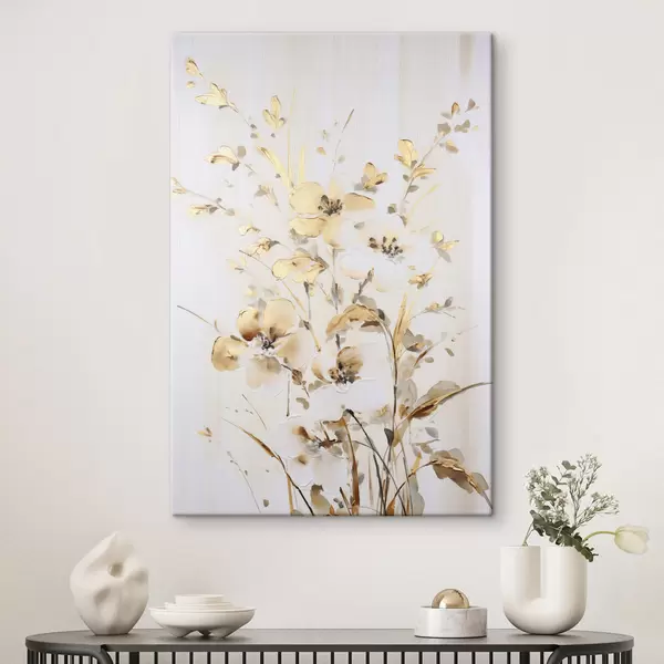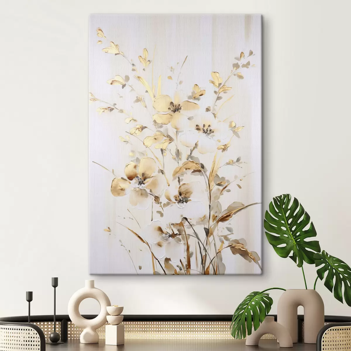 Gemälde Strukturierte gelbe Blüten und Blätter vor weißem Hintergrund, mit zarten Pinselstrichen Art. s47017