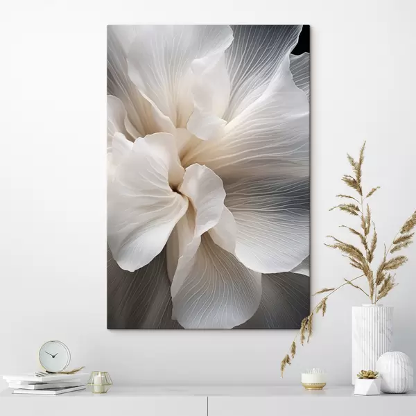 Gemälde Nahaufnahme von zarten, abstrakten weißen Blütenblättern mit filigranen Linien und einem verschwommenen dunklen Hintergrund Art. s47018