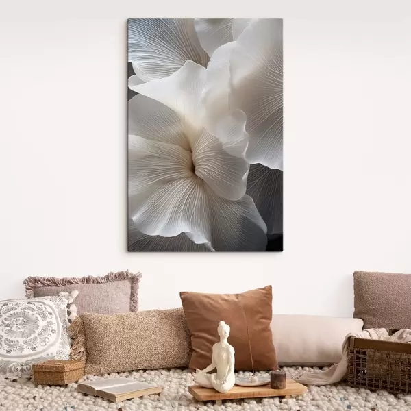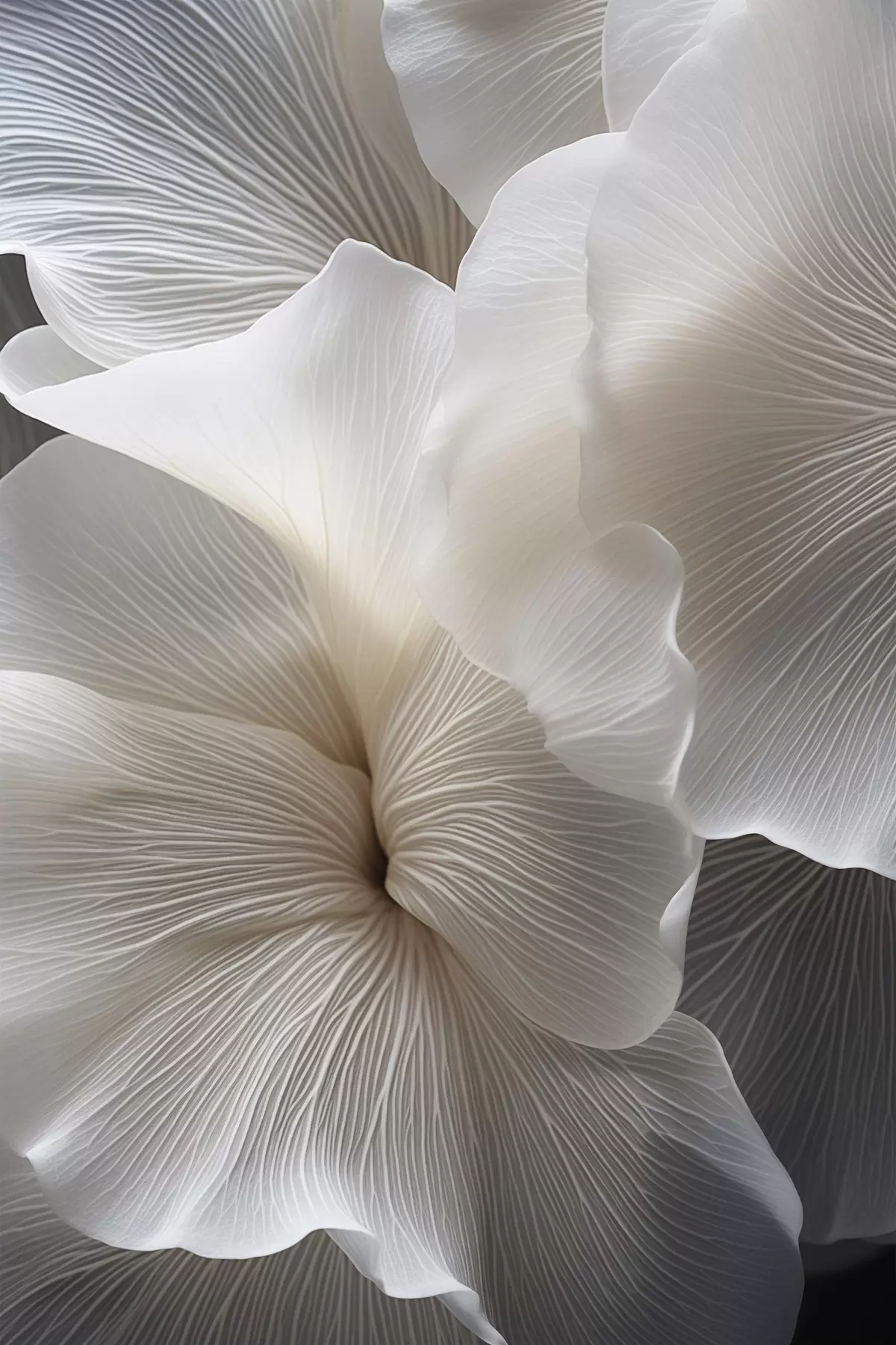 Gemälde Nahaufnahme von zarten, abstrakten weißen Blütenblättern mit filigranen Linien und einem verschwommenen dunklen Hintergrund Art. s47019