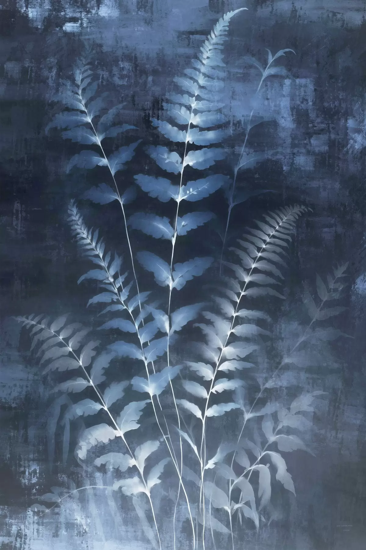 Fototapete Blaue Farne und Pflanzen vor einem dunklen, strukturierten Hintergrund, mit Fokus auf den komplexen Details, Röntgeneffekt s47027