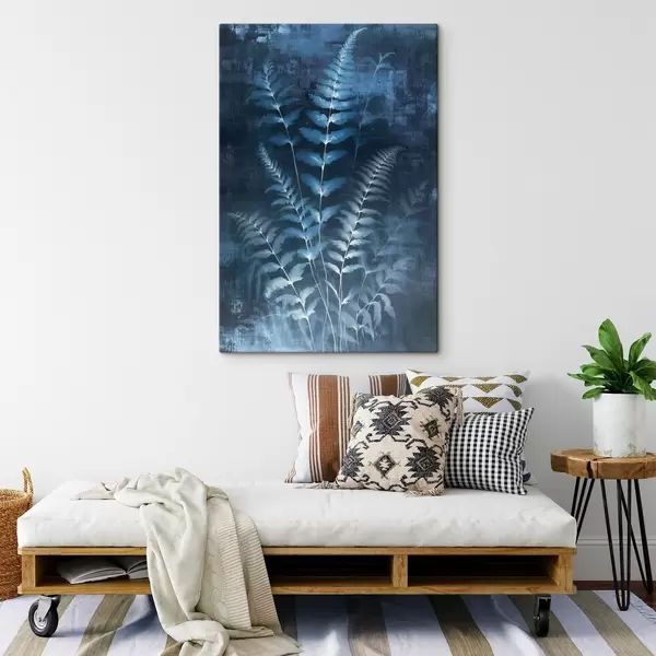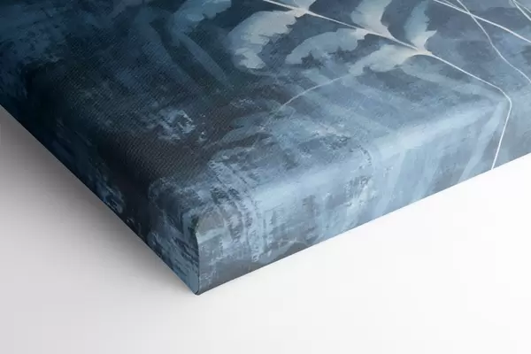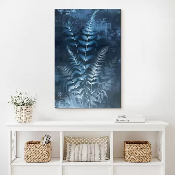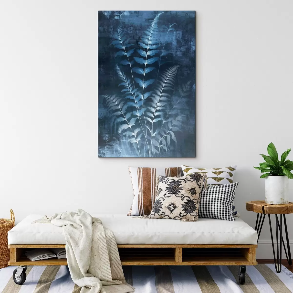 Gemälde Blaue Farne und Pflanzen vor einem dunklen, strukturierten Hintergrund, mit Fokus auf den komplexen Details, Röntgeneffekt Art. s47027