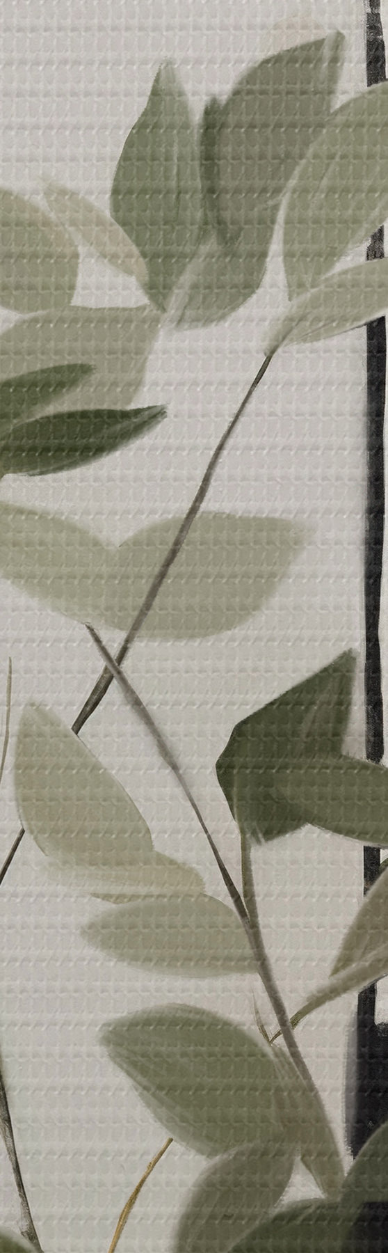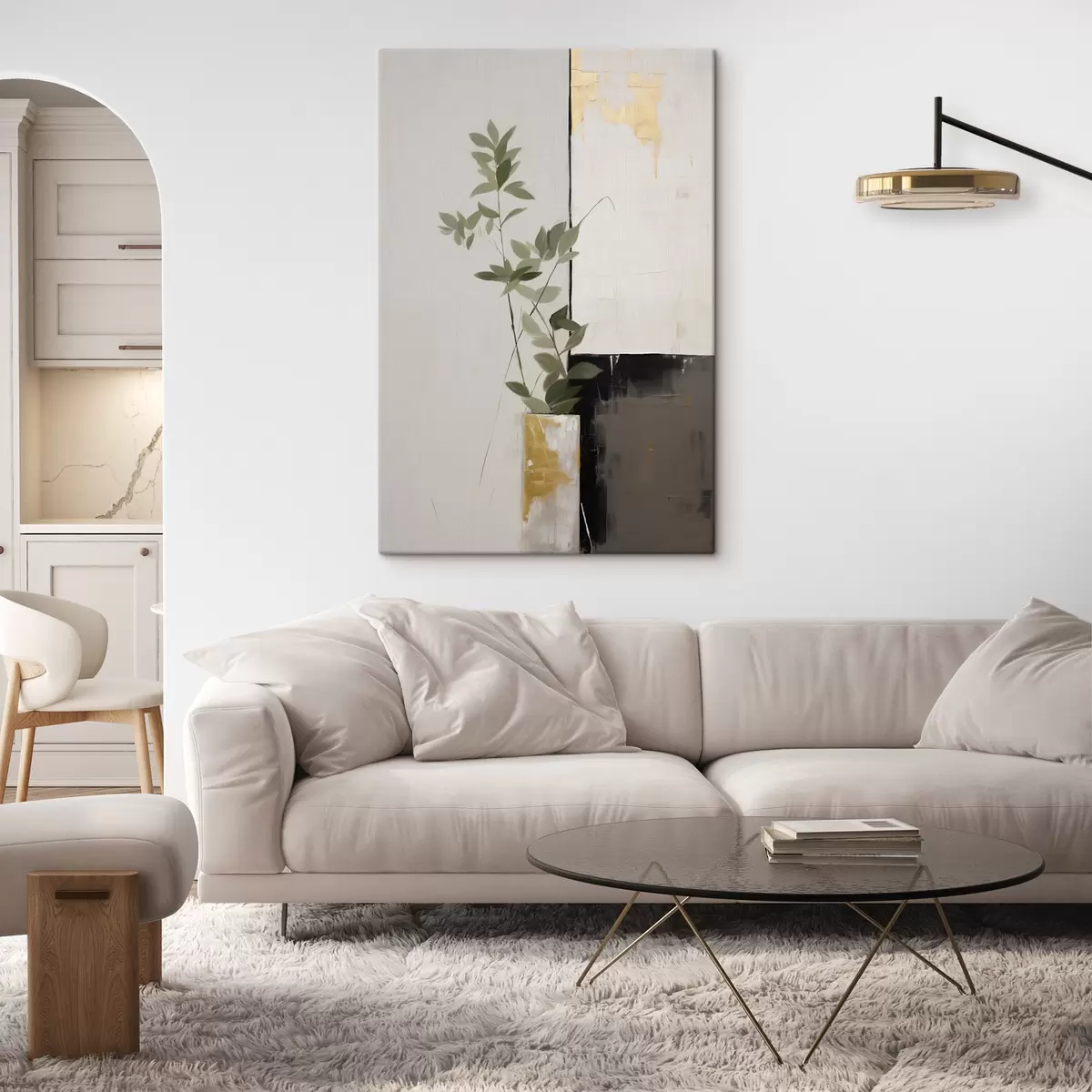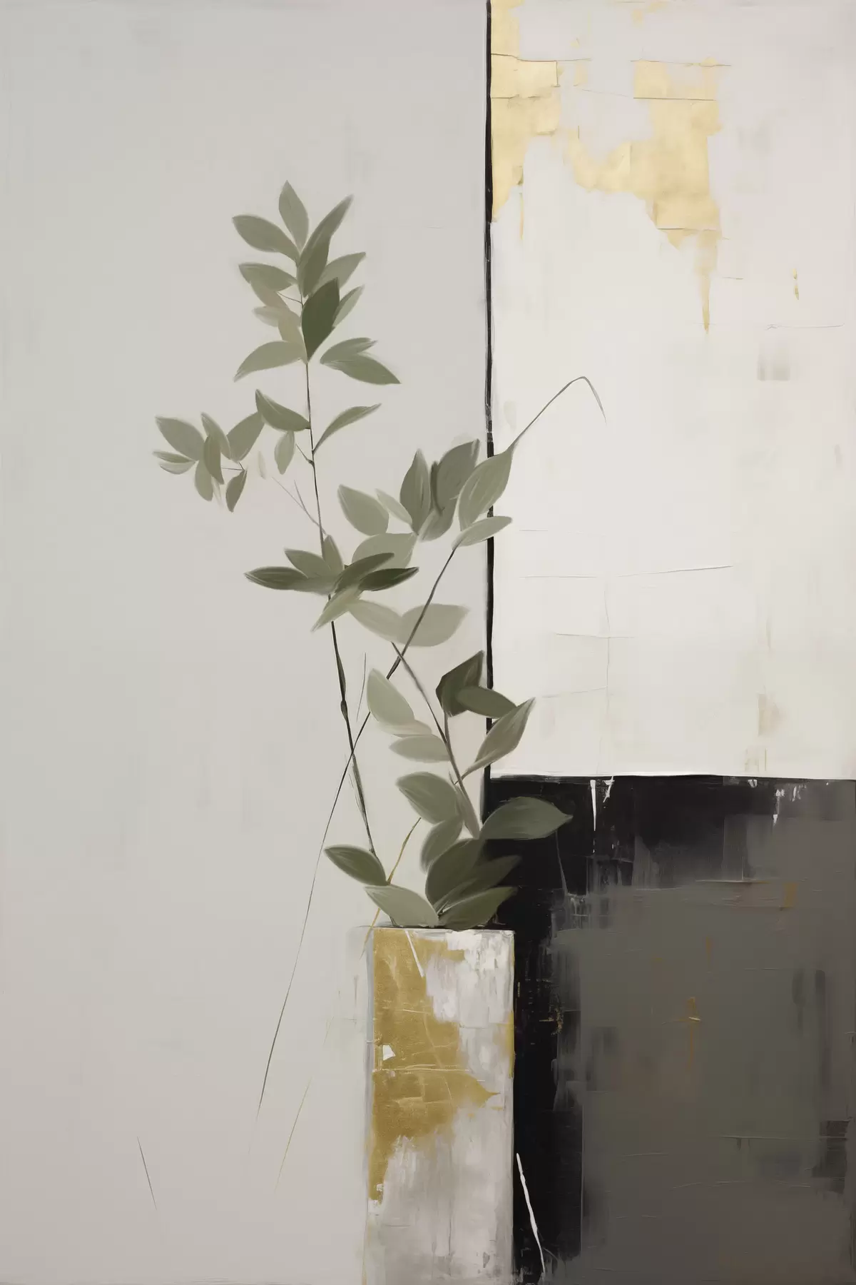Gemälde Ein minimalistisches, strukturiertes Gemälde einer Vase mit grünen Blättern vor einem Hintergrund aus abstrakten geometrischen Formen. Art. s47036