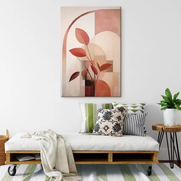 Gemälde Abstrakte Pflanze mit roten Blättern vor einem Hintergrund aus geometrischen Formen und sanften, gedämpften Farben Art. s47040