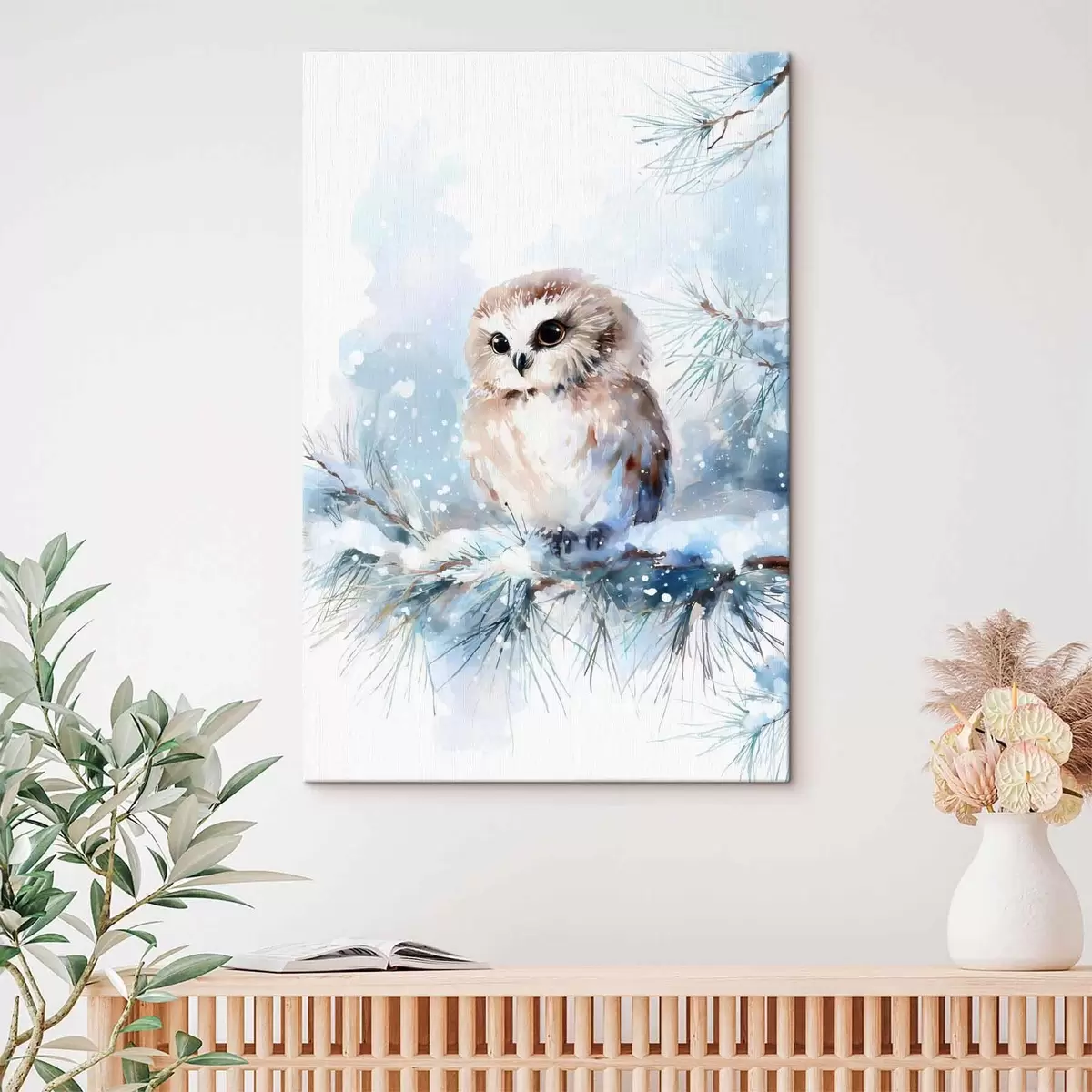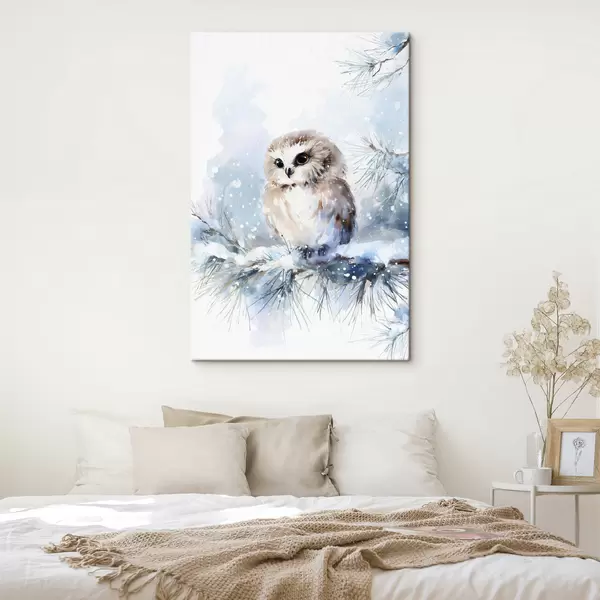 Gemälde Niedliche Eule auf einem schneebedeckten Tannenzweig im Aquarellstil Art. s47115