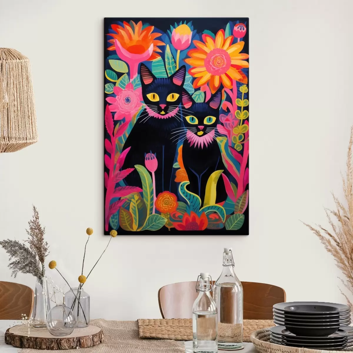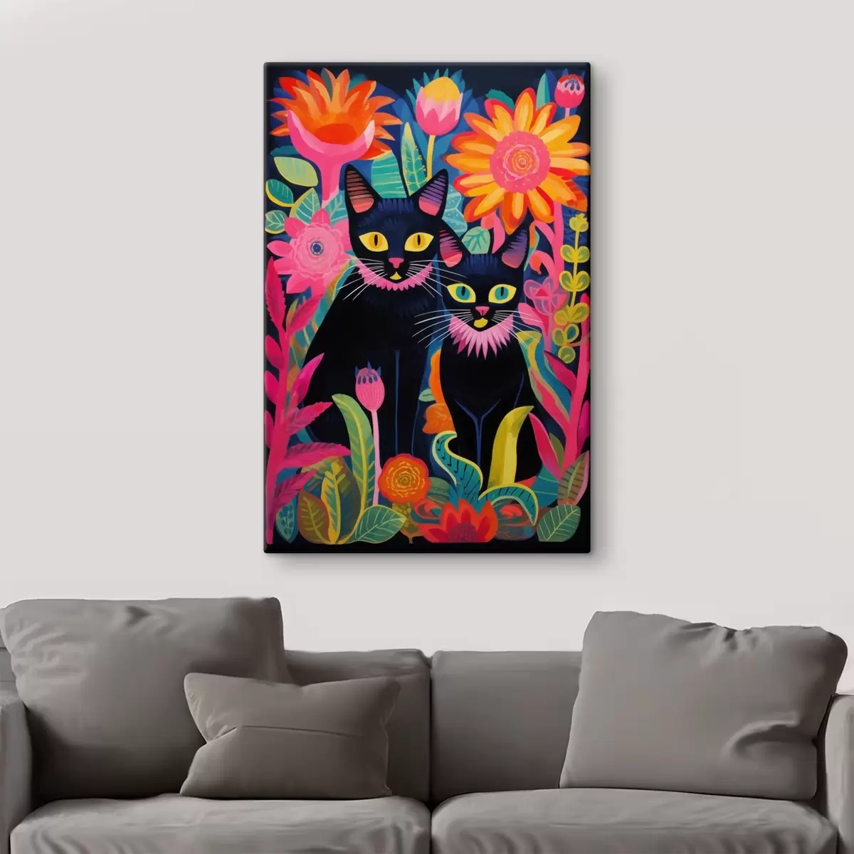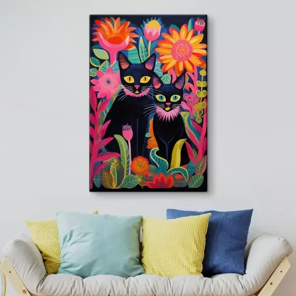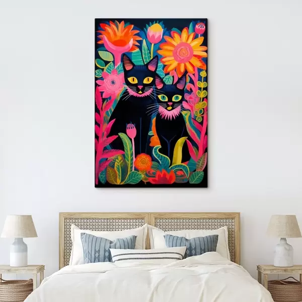 Gemälde Zwei schwarze Katzen zwischen bunten Blumen Art. s47299