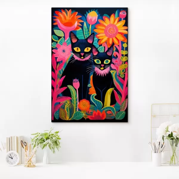 Gemälde Zwei schwarze Katzen zwischen bunten Blumen Art. s47299