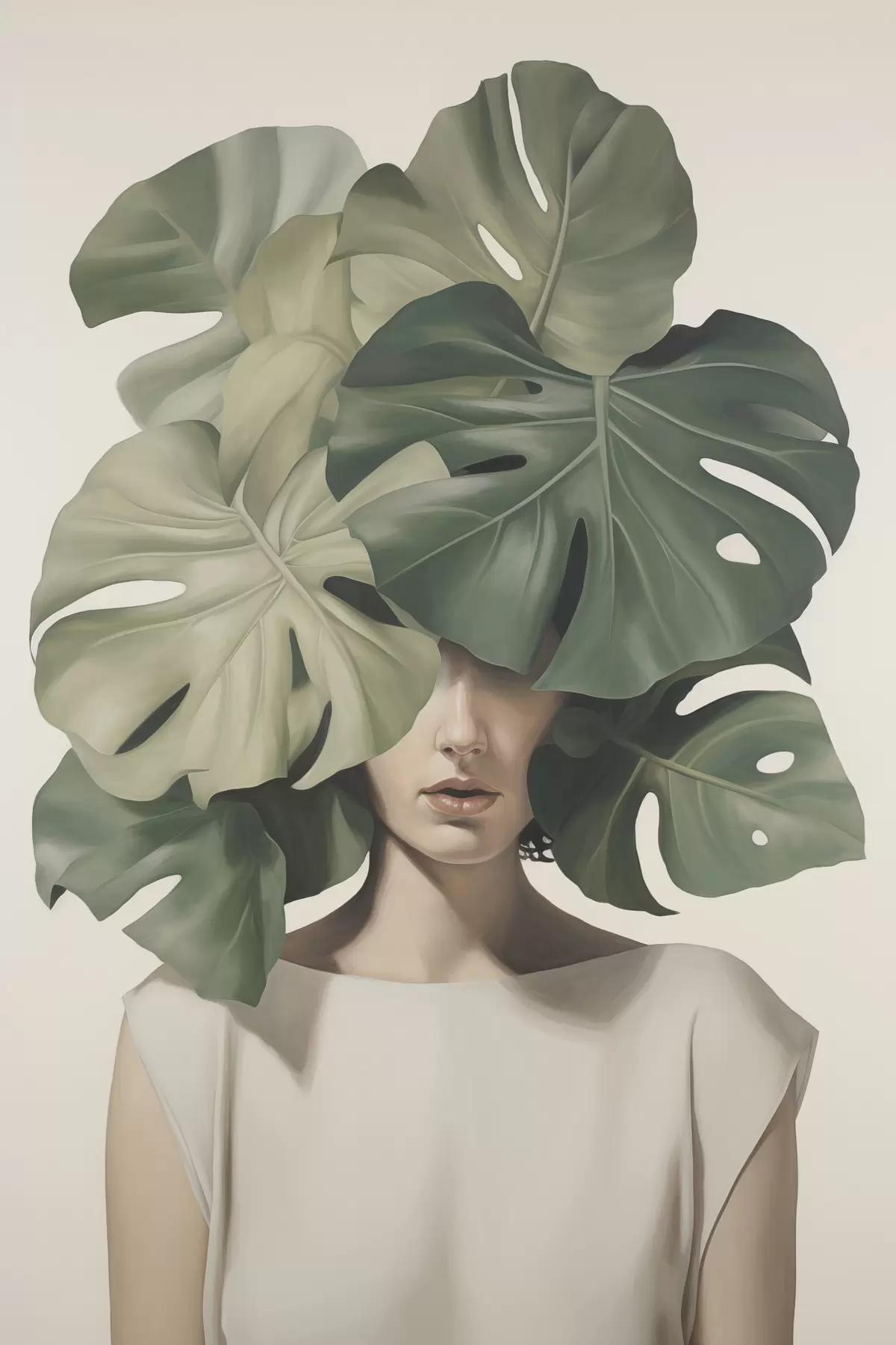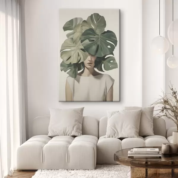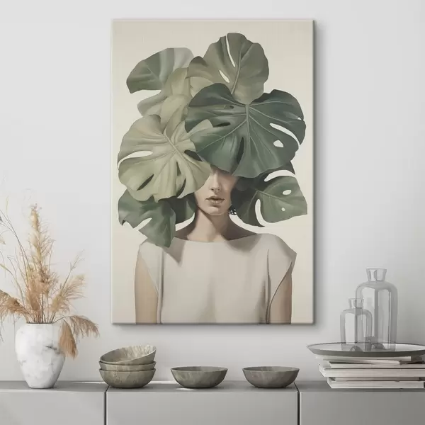 Gemälde Abstraktes Porträt eines Mädchens mit Monstera-Blättern Art. s47336
