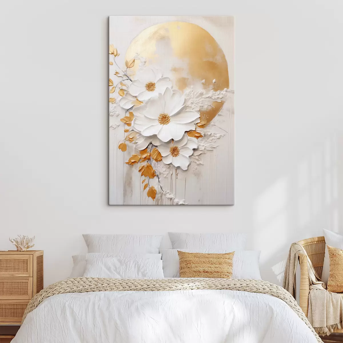 Gemälde Weiße Blumen mit gelben Akzenten und zarten Blättern vor einem strukturierten Hintergrund, moderne Kunst Art. s47414