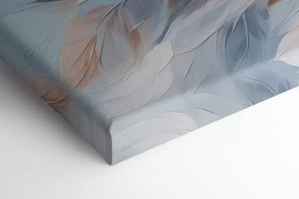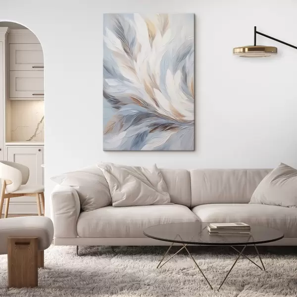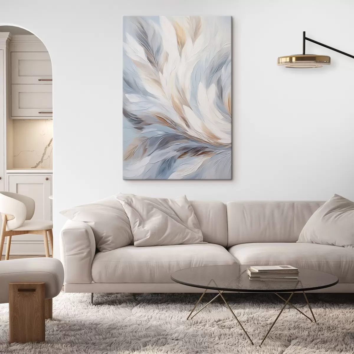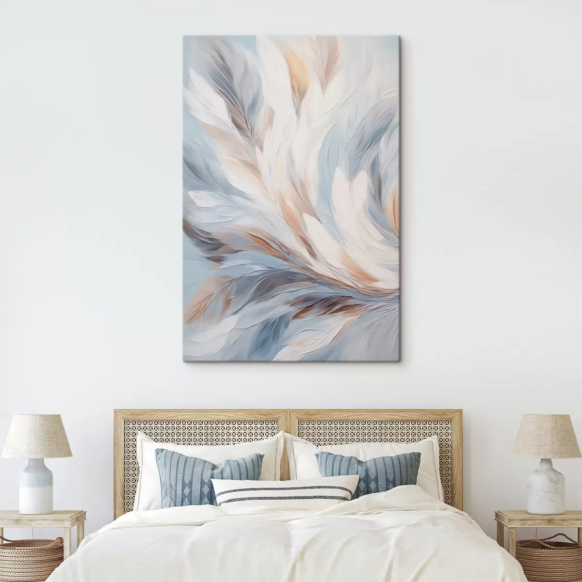 Gemälde Abstrakte Malerei von Federn in Weiß-, Blau- und Brauntönen, mit einer weichen, fließenden Textur und einem hellen Hintergrund Art. s47417