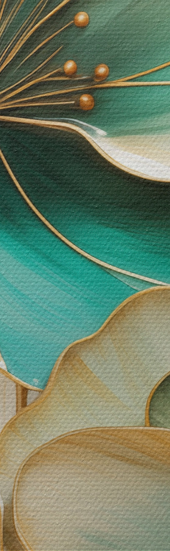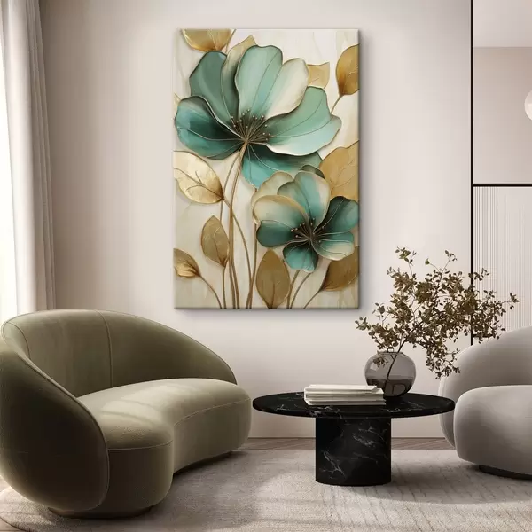 Gemälde Große blaugrüne und gelbe Blumen mit Konturen, umgeben von gelben Blättern vor abstraktem Hintergrund Art. s47418