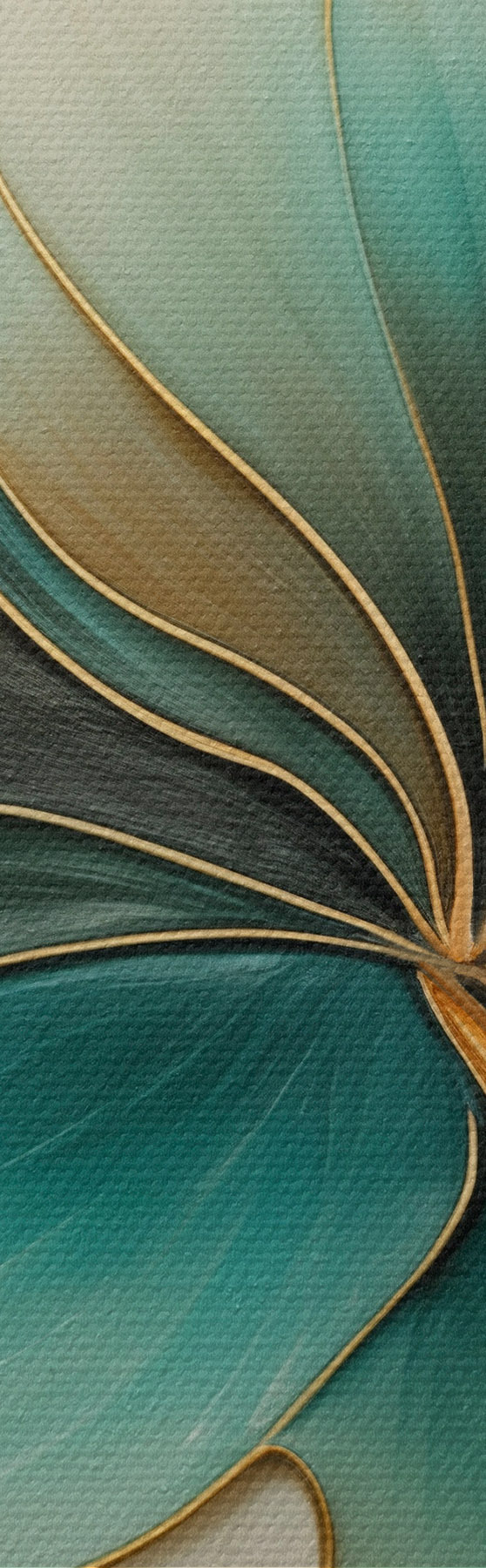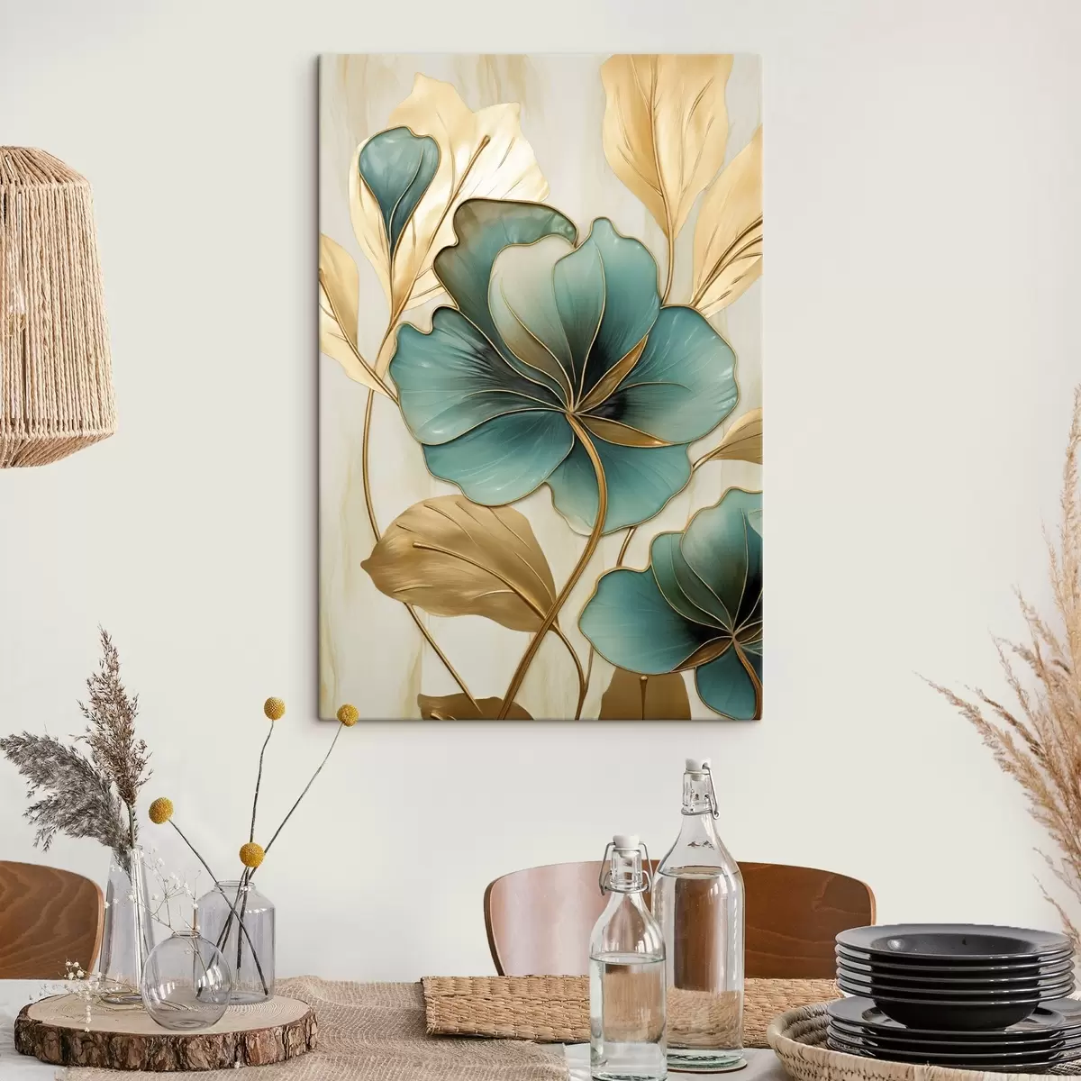 Gemälde Große blaugrüne und gelbe Blumen mit Konturen, umgeben von gelben Blättern vor abstraktem Hintergrund Art. s47419