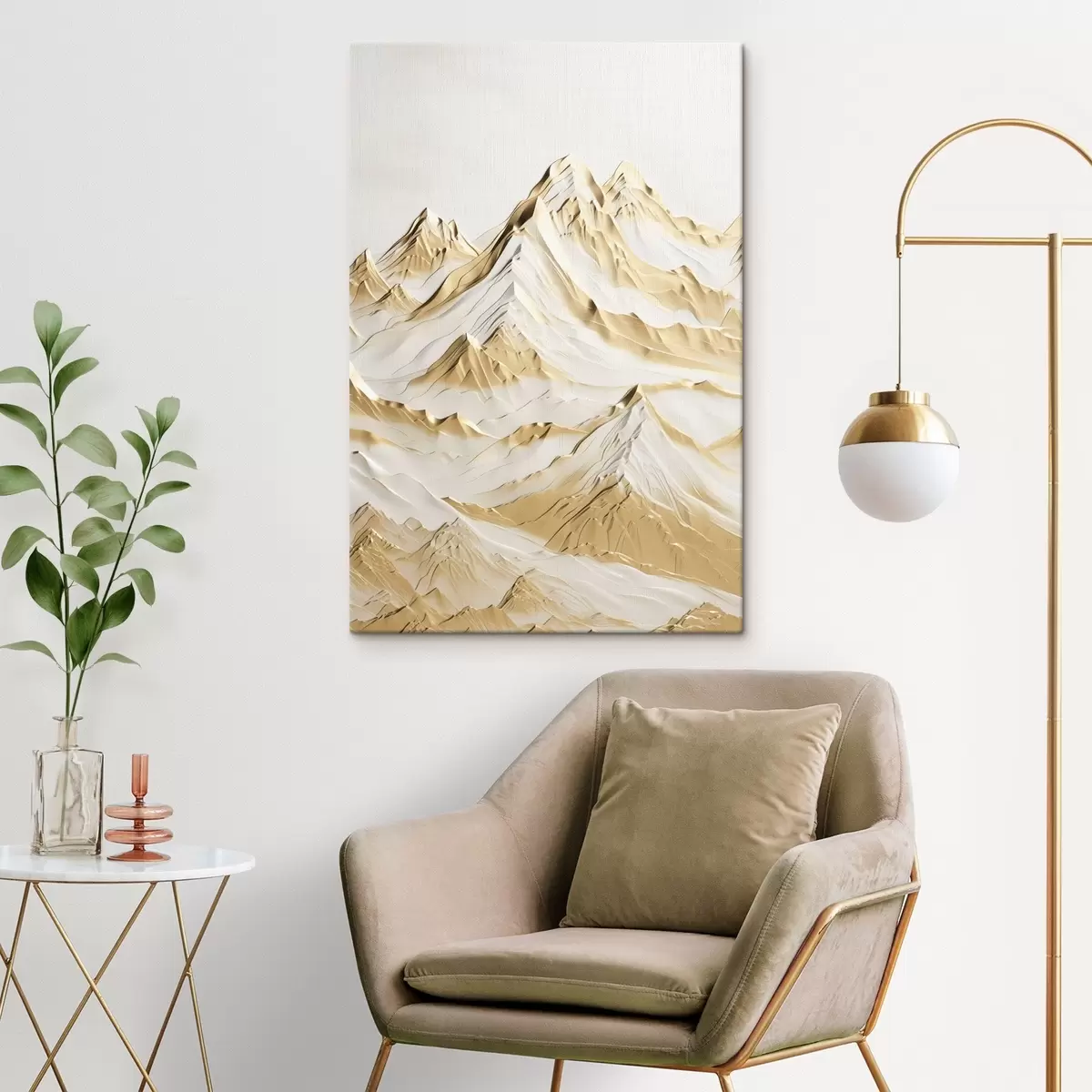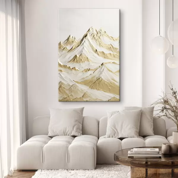 Gemälde Eine Landschaft aus gelben, schneebedeckten Bergen mit scharfen Gipfeln und tiefen Tälern unter einem hellen Himmel Art. s47420