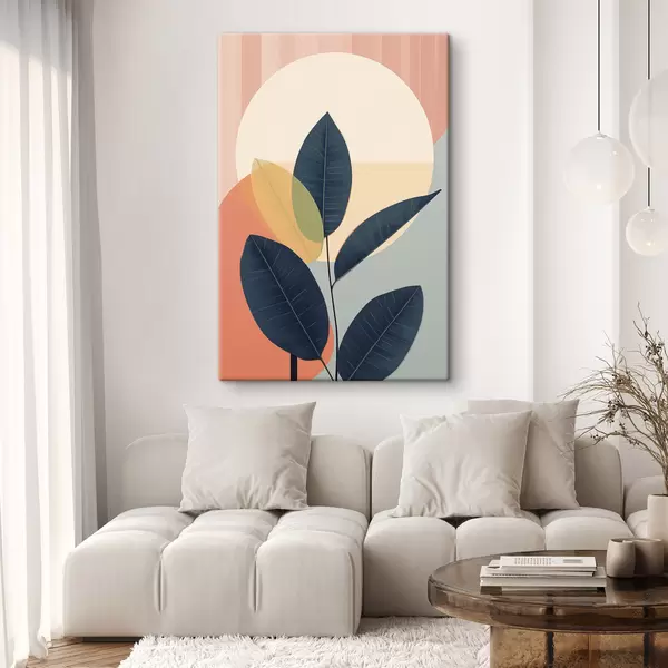 Fototapete Dunkle Blätter vor einem Hintergrund aus abstrakten Formen in Pfirsich und Grau mit einem großen, hellgelben Kreis s47424