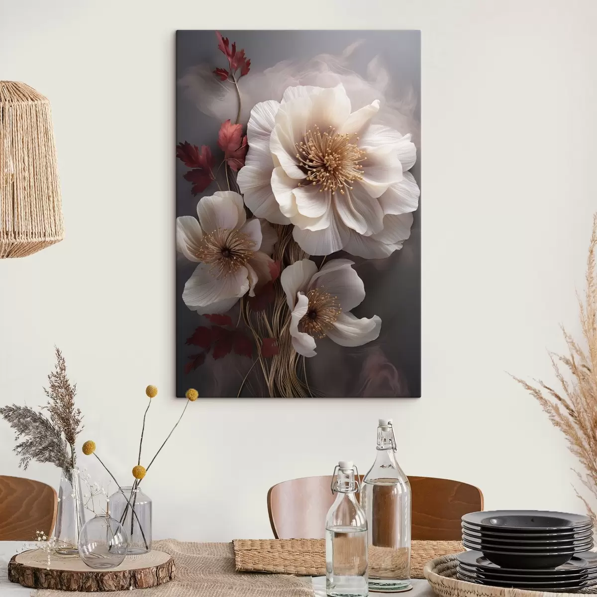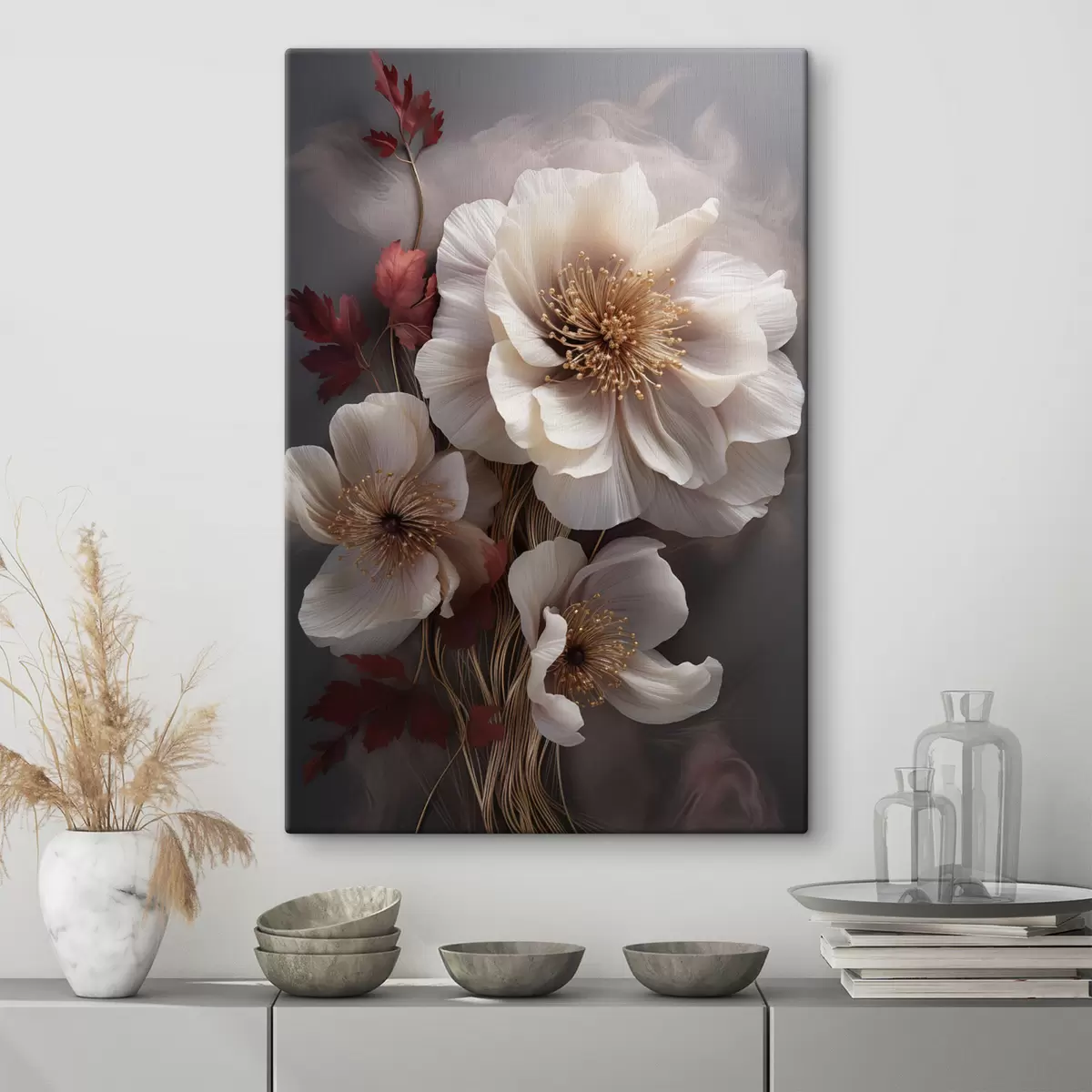 Gemälde Zarte Pfingstrosen mit dünnen, zarten Blütenblättern, umgeben von dunkelroten Blättern vor einem abstrakten Hintergrund Art. s47434