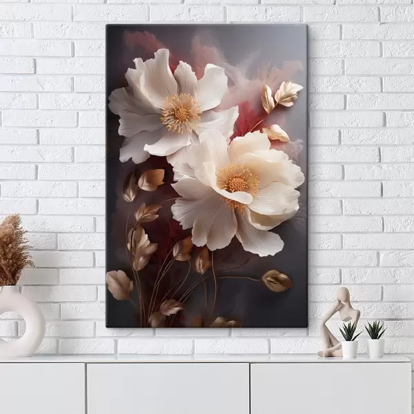 Gemälde Zarte Pfingstrosen mit dünnen, zarten Blütenblättern, umgeben von dunkelroten und gelben Blättern vor einem abstrakten Hintergrund Art. s47435