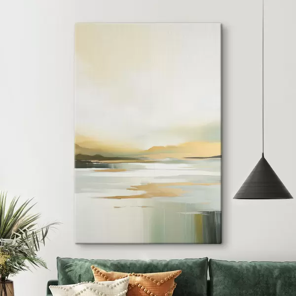Gemälde Abstrakte Landschaft mit Gelb- und Grüntönen, Wasser, das den Himmel und entfernte Berge reflektiert, blasser, dunstiger Himmel Art. s47439
