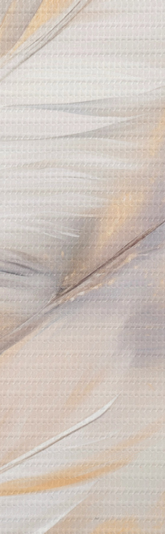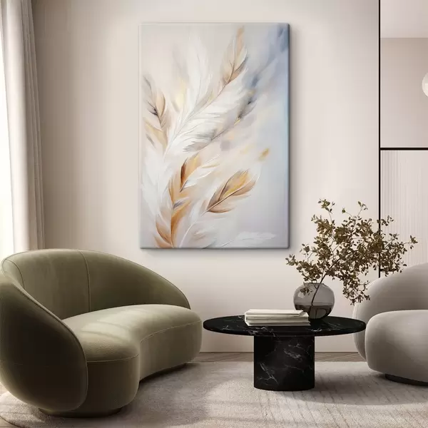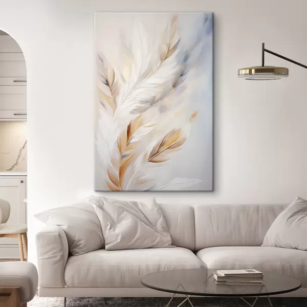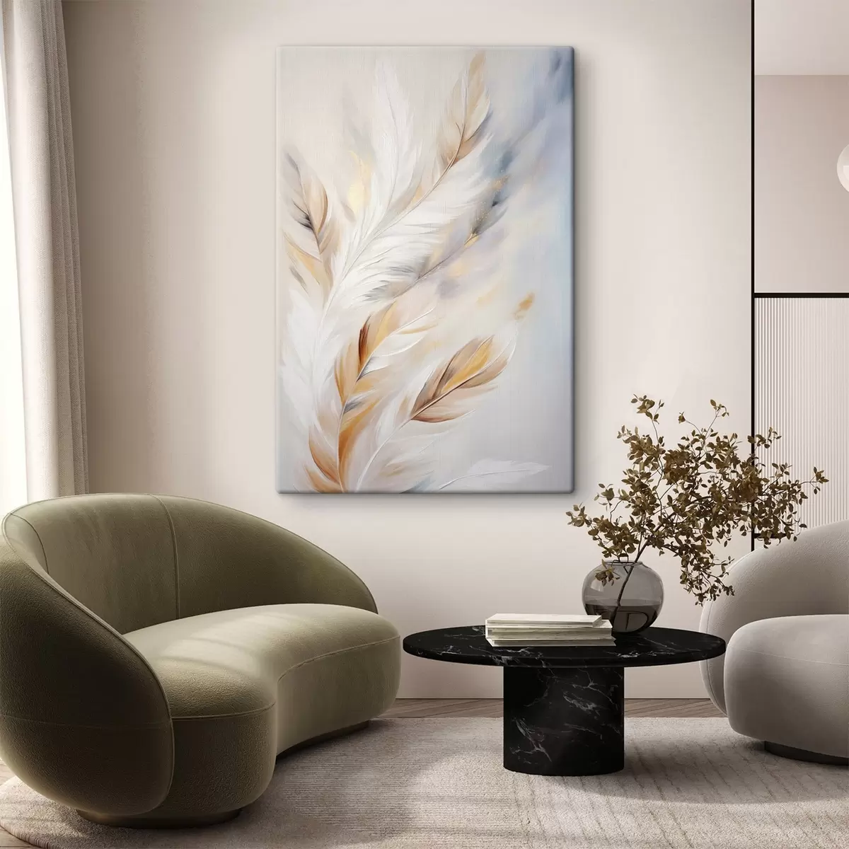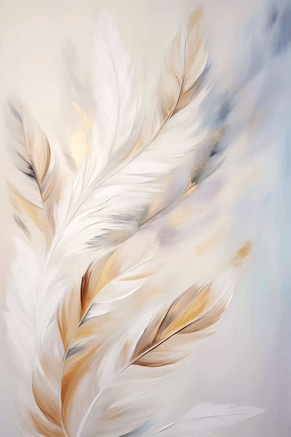 Gemälde Große, weiche Federn in einer Mischung aus Weiß-, Gelb- und Brauntönen vor einem hellen, abstrakten Hintergrund Art. s47443