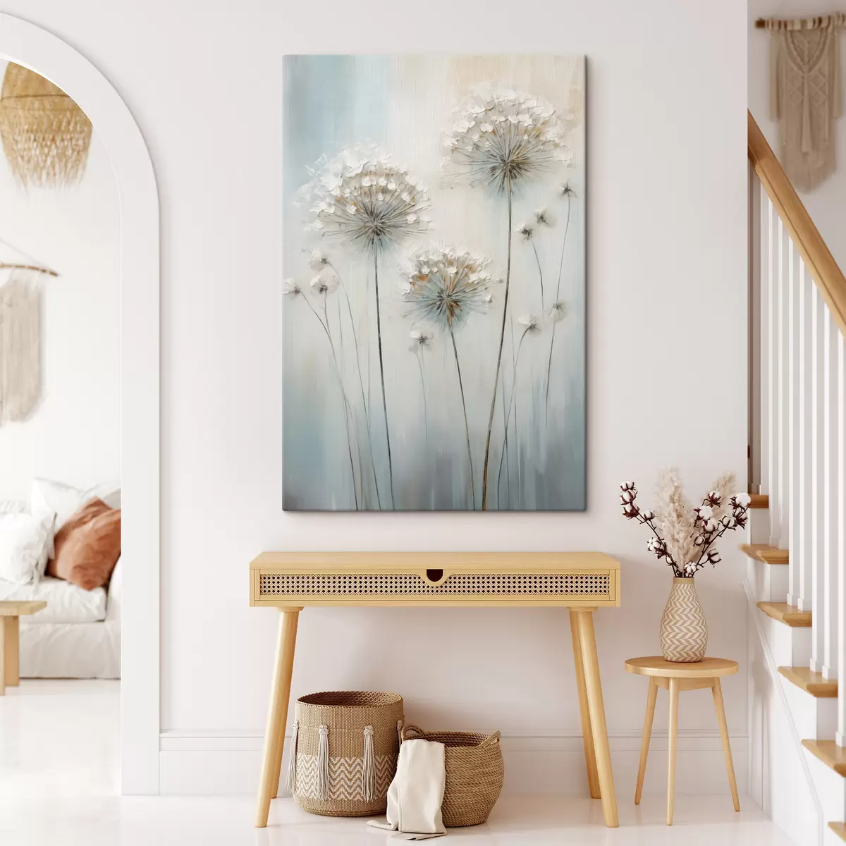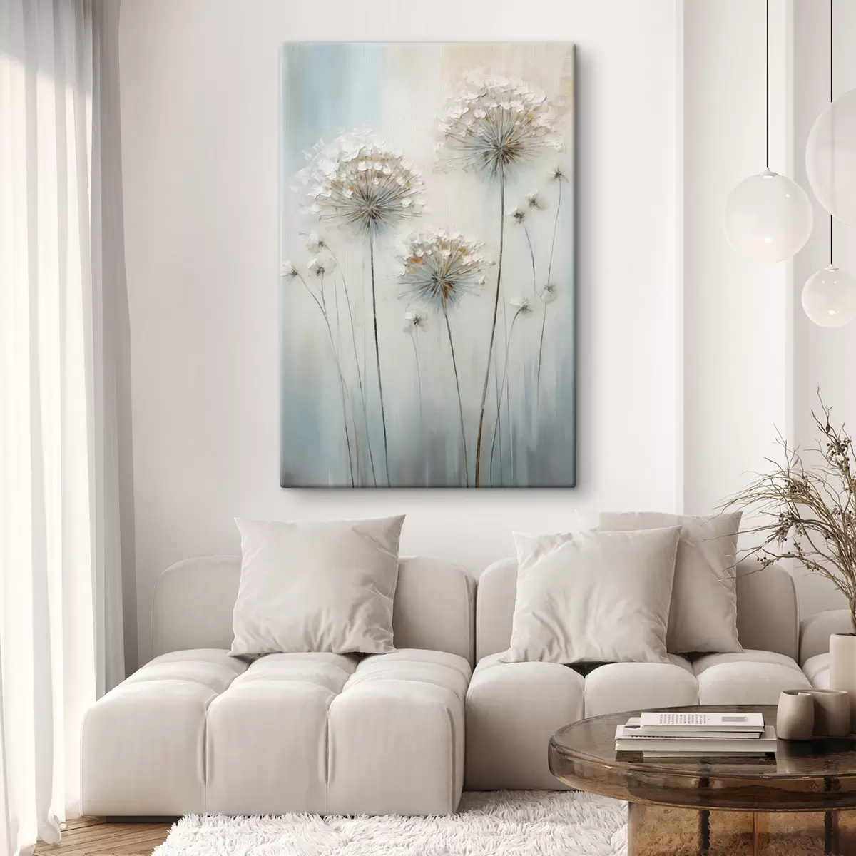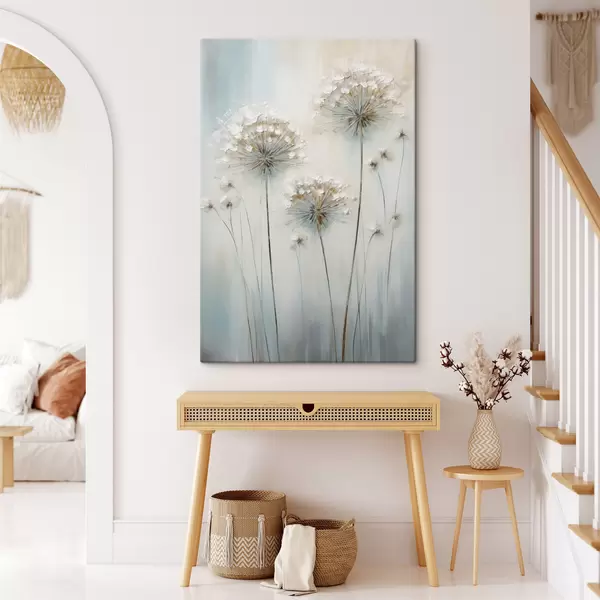Gemälde Strukturierter Malstil von Löwenzahn vor einem sanften blau-weißen Hintergrund Art. s47855