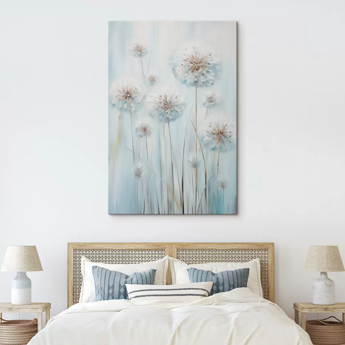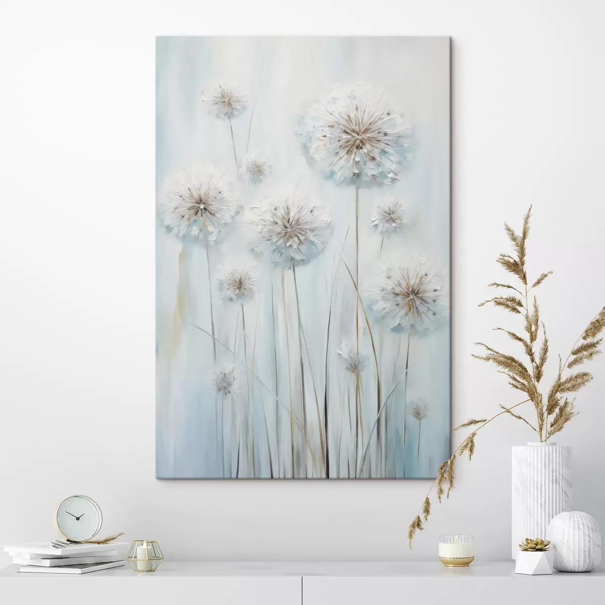 Gemälde Strukturierter Malstil von Löwenzahn vor einem sanften blau-weißen Hintergrund Art. s47856