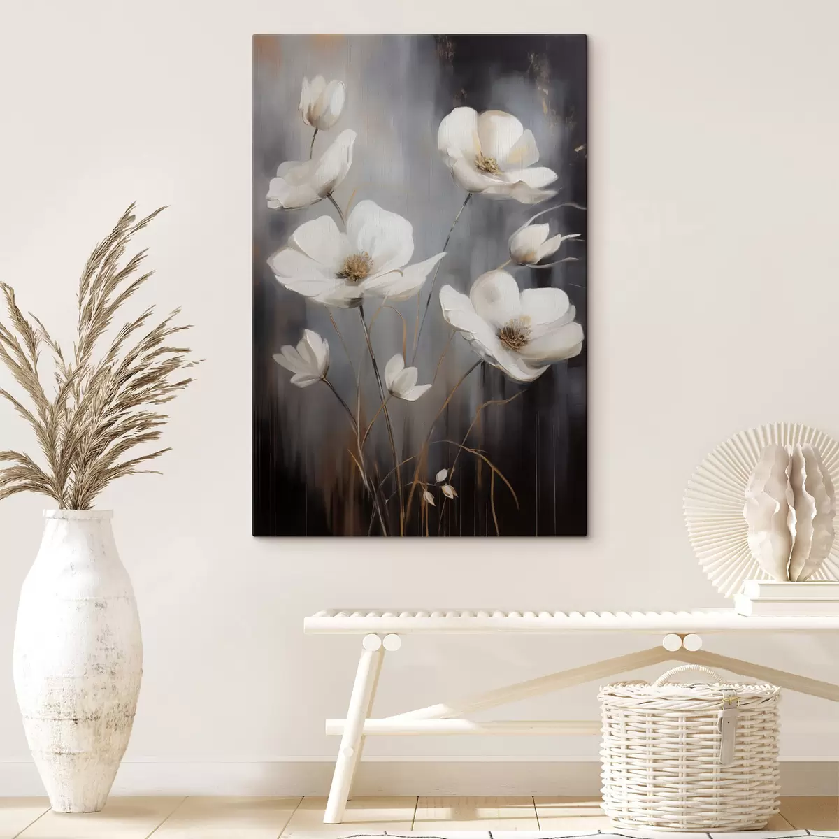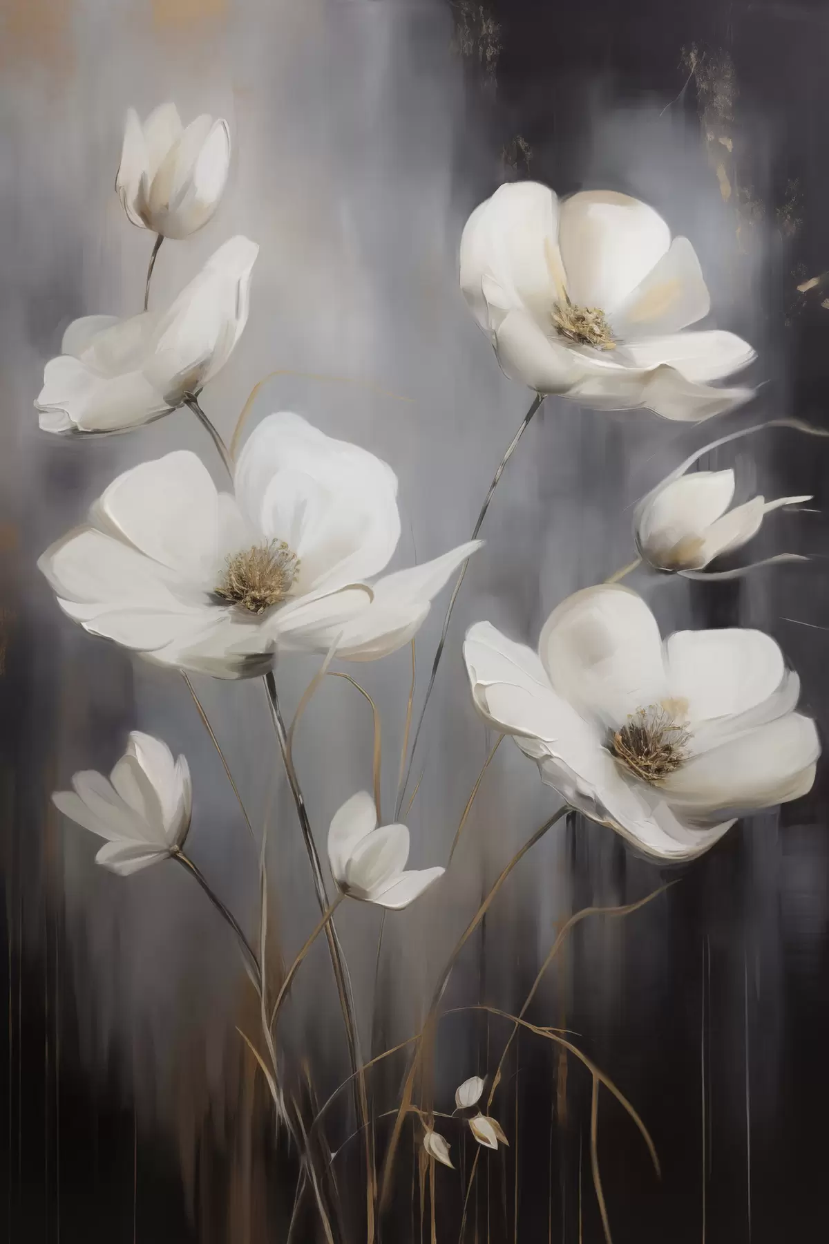 Gemälde Weiße Blüten mit braunen Zentren und dünnen Stielen vor einem dunklen, strukturierten Hintergrund Art. s47858
