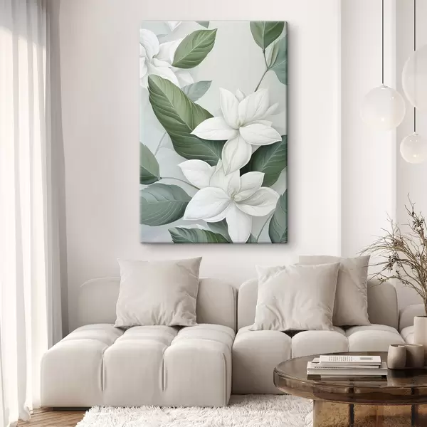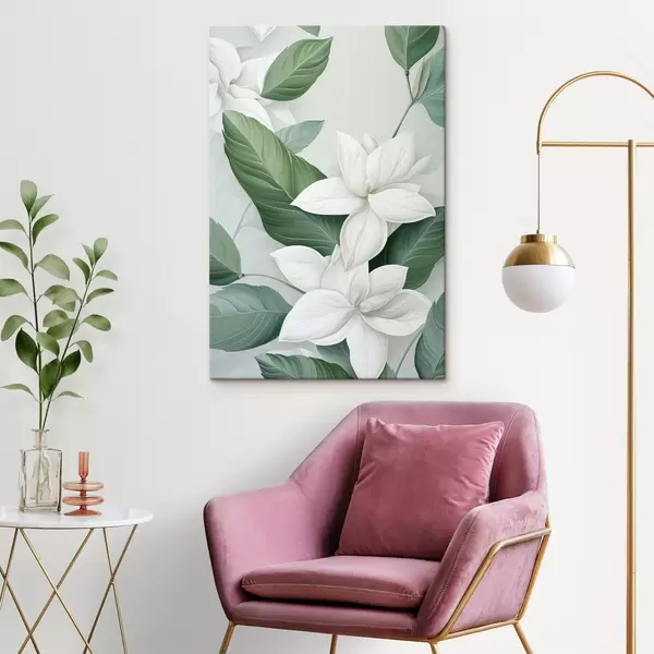 Gemälde Weiße Blumen mit grünen Blättern, pastellfarbener Hintergrund Art. s47869
