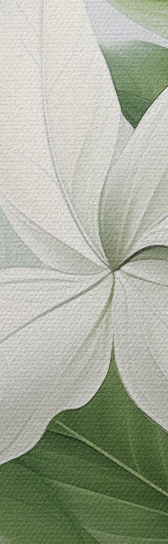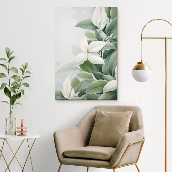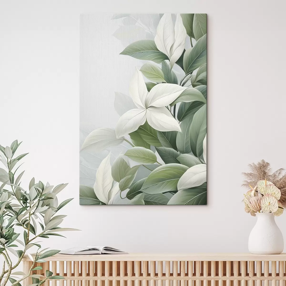 Gemälde Weiße Blumen mit grünen Blättern, pastellfarbener Hintergrund Art. s47870