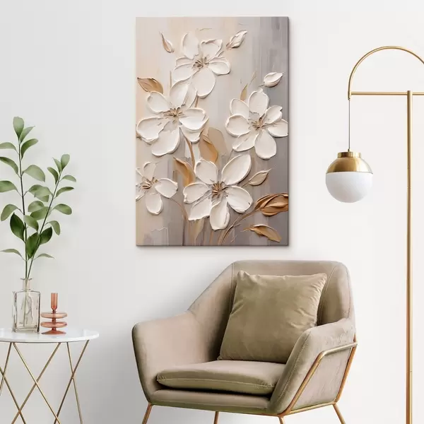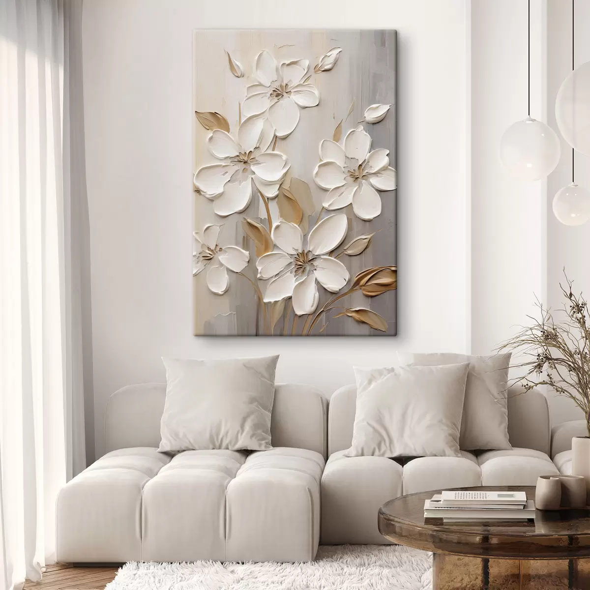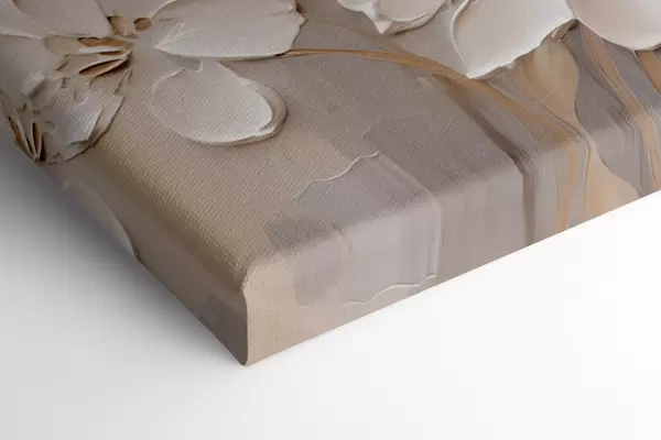 Gemälde Abstrakte weiße Blumen mit strukturierten Blütenblättern vor einem neutralen Hintergrund mit subtilen Pinselstrichen. Art. s47874