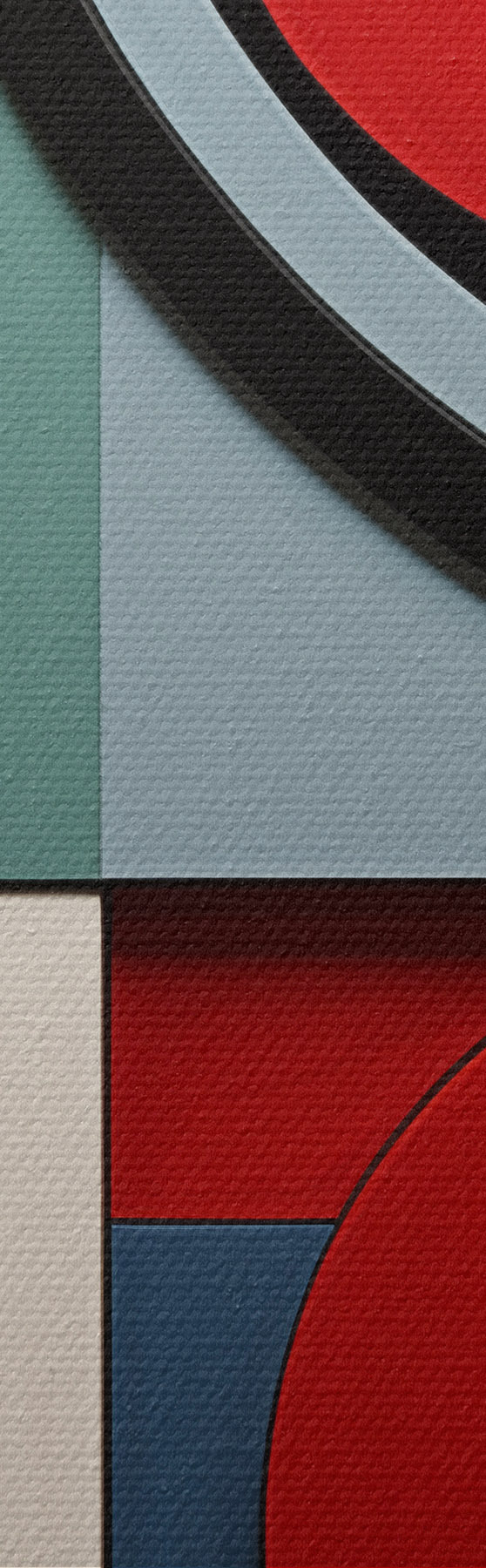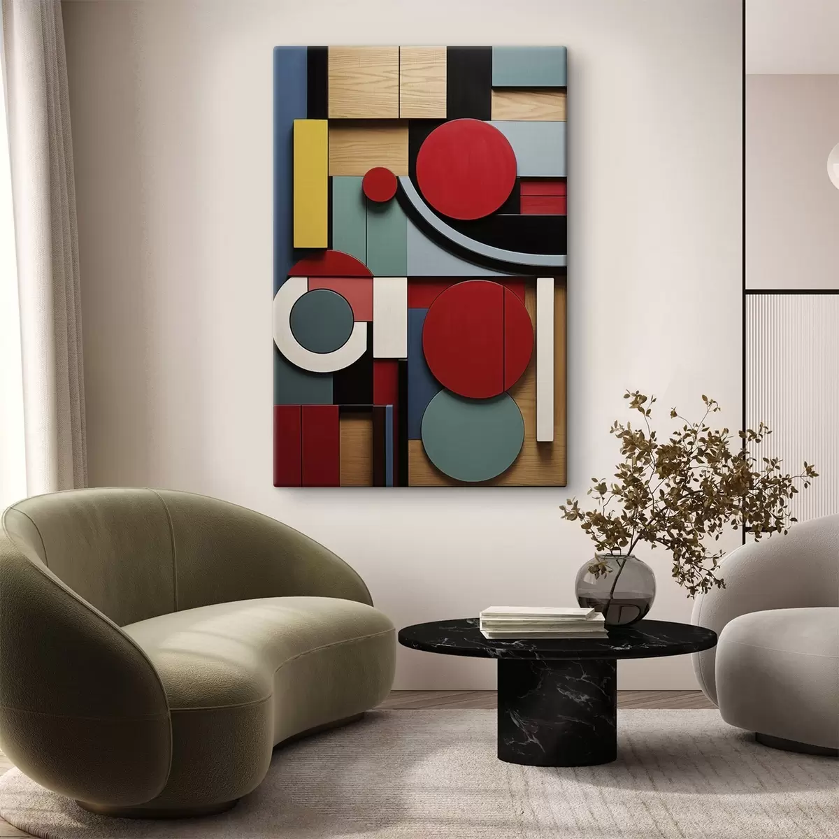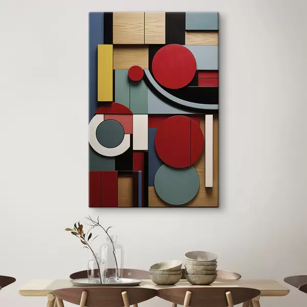 Gemälde Abstrakte geometrische Komposition mit Holzstrukturimitation, roten, schwarzen, weißen und blaugrünen Rechtecken und Kreisen Art. s47876